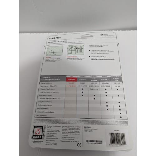 New TI-83 Plus is an easy-to-use graphing Calculator for High School and College Math and Science. Ideal for algebra through pre-calculus, plus powerful statistics and finance features. Offers flash technology to upgrade. Financial functions include TVM, cash flows, amortization, and complex numbers. Enhanced data analysis includes logistic and sine regressions. Graphs 10 rectangular functions, six parametric expressions, six polar expressions, and three recursively defined sequences. I/O port with unit-to-unit link cable (included). Offers large 64" x 96" pixel, 8" x 16" display, 24KB of RAM and 160KB Flash ROM memory for data archive and storage of Apps.