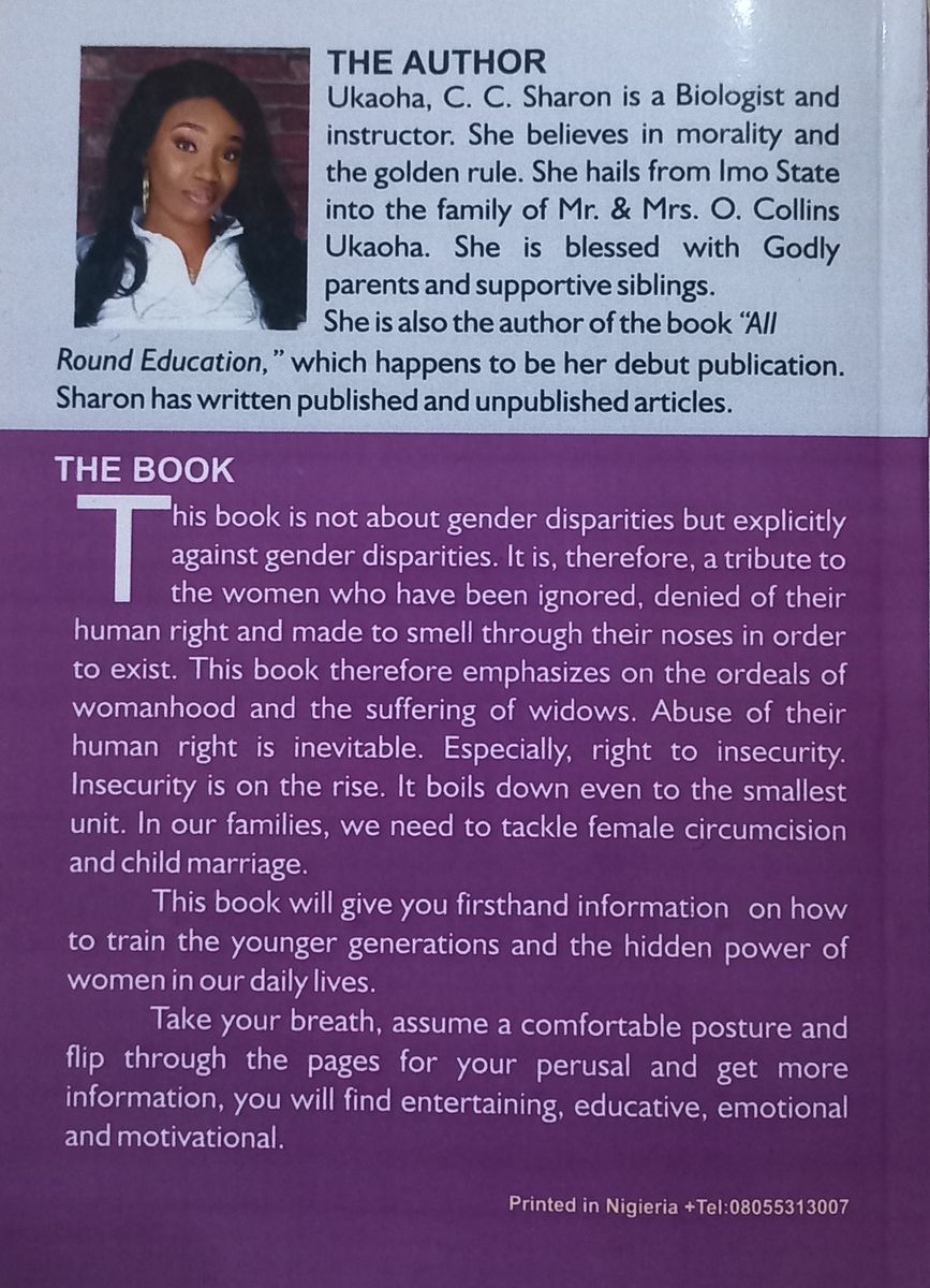 The Plight of Womanhood by Ukaoha C.Cynthia SharonThis book is not about gender disparities but explicitly against gender disparities. It is, therefore, a tribute to the women who have been ignored, denied of their human right and made to smell through their noses in order to exist. this book therefore emphasizes on the ordeals of womanhood and the suffering of windows. Abuse of their human rights is inevitable,especially right to security. Insecurity is on the rise. It boils down even to the smallest unit.In our families, we need to tackle female circumcision and child marriage.