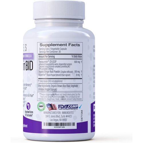 Theracurmin BID IMMUNOVITES Advanced Formula combines the convenience of Theracurmin into a single capsule with Ginger and Bioperine for added support.* | Theracurmin 600mg Theracurmin is a Patented highly bioavailable and absorptive Curcumin preparation. | Organic Ginger Root Powder 100mg Ginger Root added for its healing and anti-inflammatory support. Formulated to soothe the stomach and GI system. | Bioperine (Black Pepper Extract) 8mg Bioperine, another patented ingredient in our Advanced Formula, to aid via it absorption inducing properties. Formulated to be gentle on the stomach. |