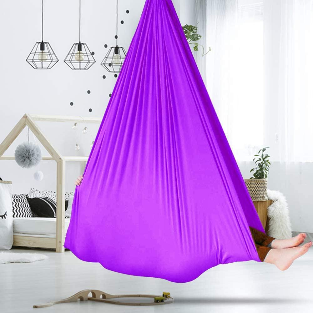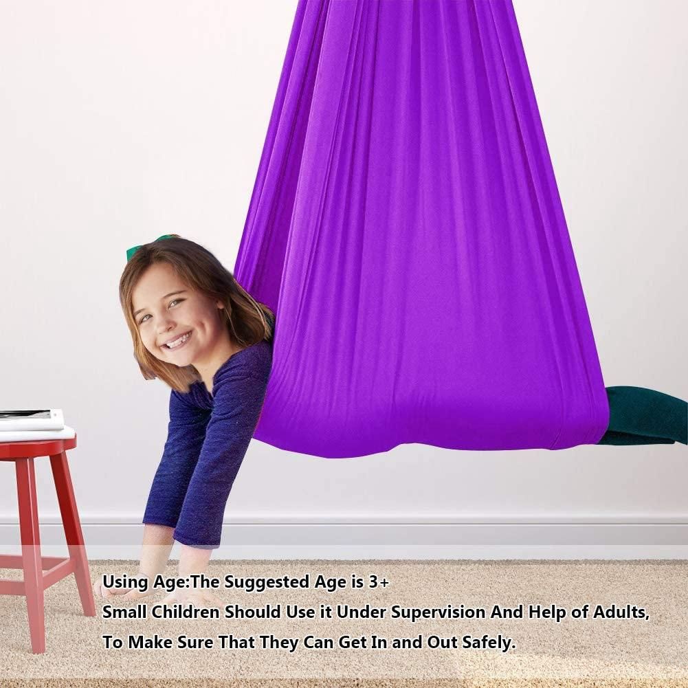 [SOFT AND COMFORTABLE]: This therapy swing is made of high quality material--soft & silk nylon. It measures 280 * 100CM. Kids can sit and cocoon comfortably in the hammock with a sense of calmness. Our updated hammock can block out unwanted sensory stimulation.