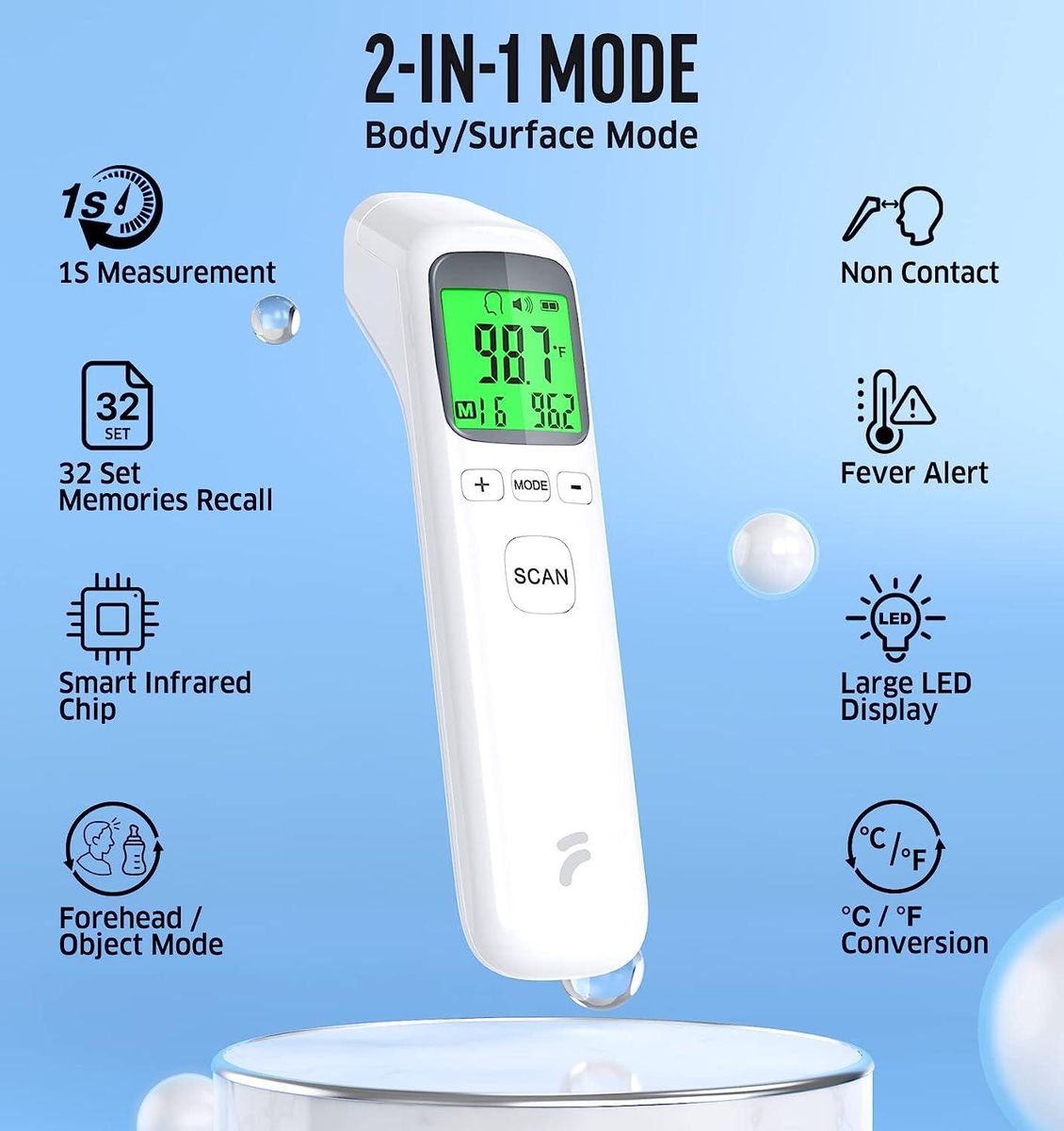 Dual Mode -- This digital thermometer is designed for adults, infants and elders. It not only could measuring temperature as forehead thermometer ,switching measurement mode at any time to take object temperature easily.And free choice of degrees Fahrenheit or Celsius.