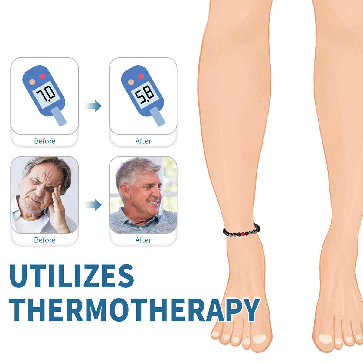 Thermotherapy Sugar Regulating Anklet: By wearing the thermotherapy sugar regulating anklet, individuals may experience a reduction in the discomforts associated with high blood sugar, leading to an overall improvement in their quality of life.