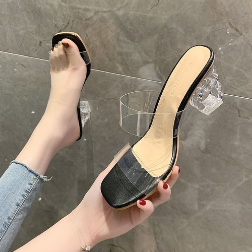 1X Thick Square Low Heels Shoes Woman Transparent Sandals Plus Size 42/43 Ladies Flip Flops OL Nude Sandalias Mujer Clear Slippers
