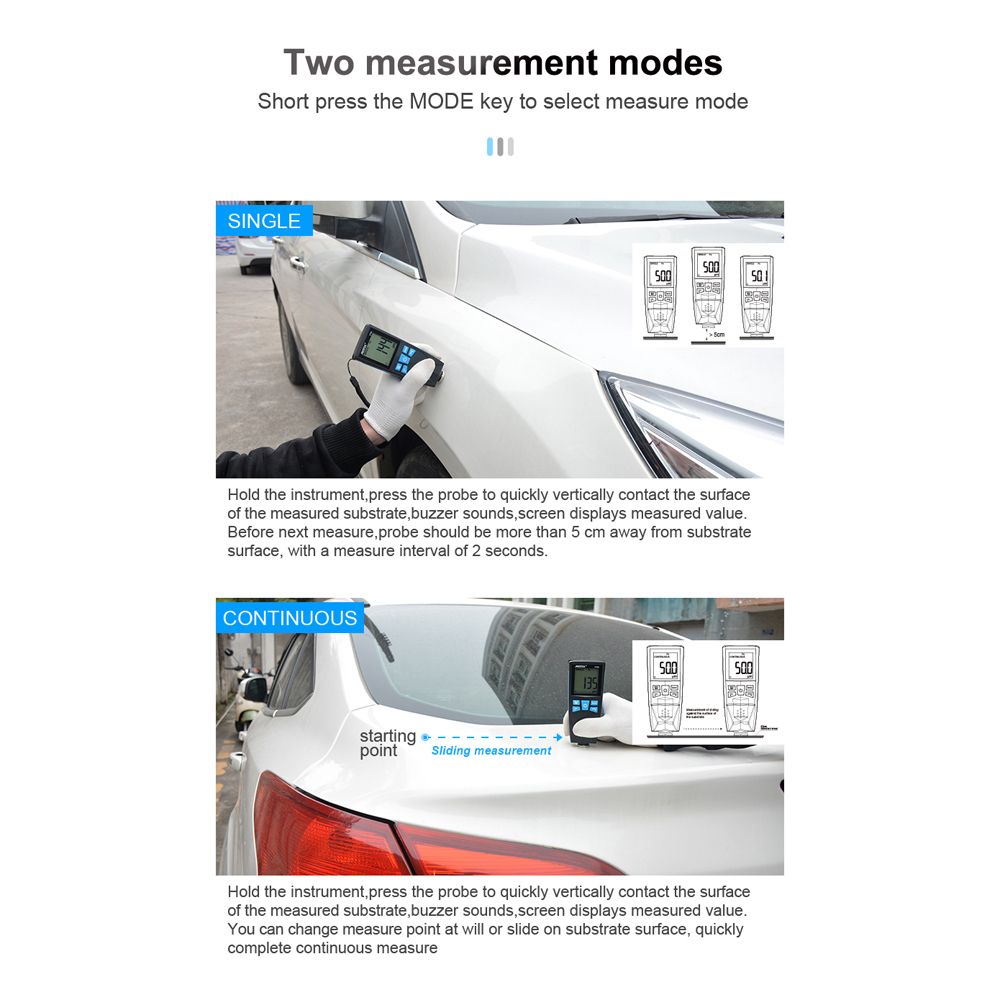 Single Point Mode: Quickly press the probe vertically against the surface of the substrate to be measured, a beep will sound and the measurement value will be displayed on the screen, the probe should leave the surface of the substrate for more than 50mm before another measurement, the measurement interval is 2 seconds.