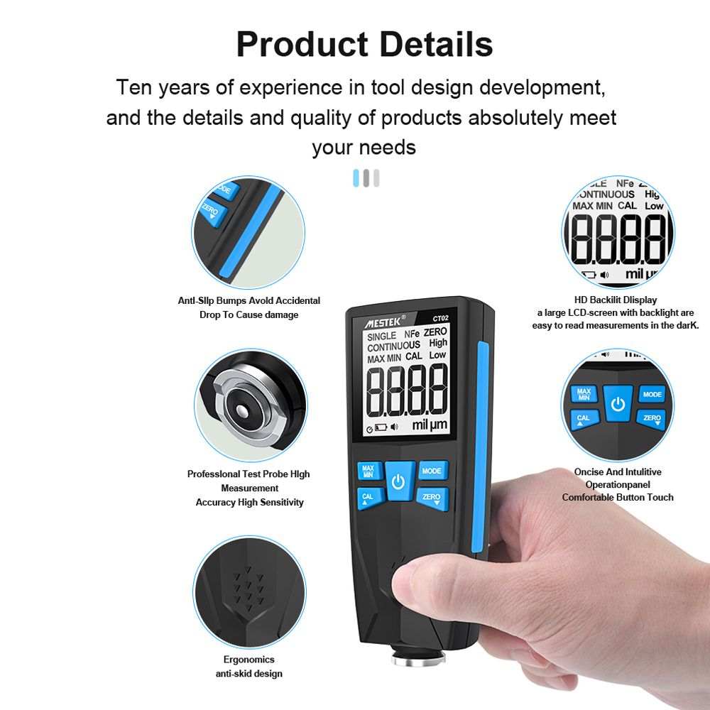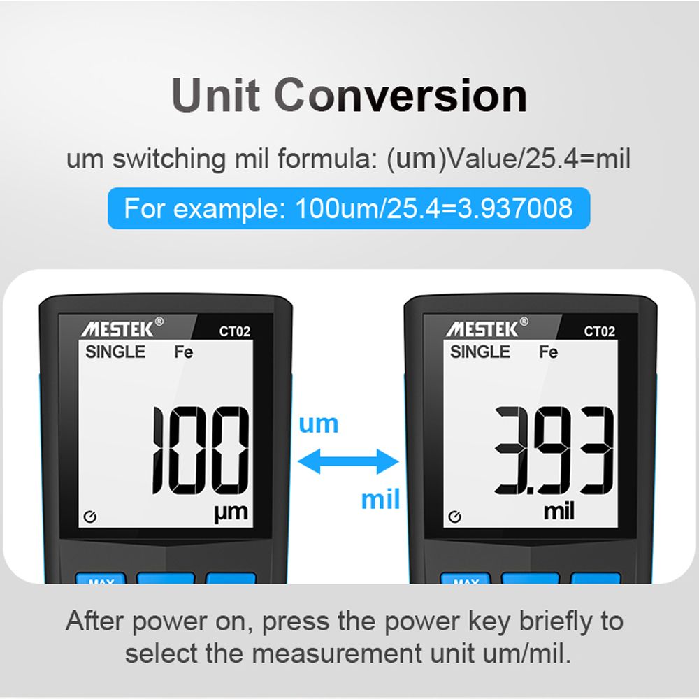 Multi-functional Design: Data clearing, μm/mil unit conversion, automatic switch-off for approx. 10 minutes without operation.