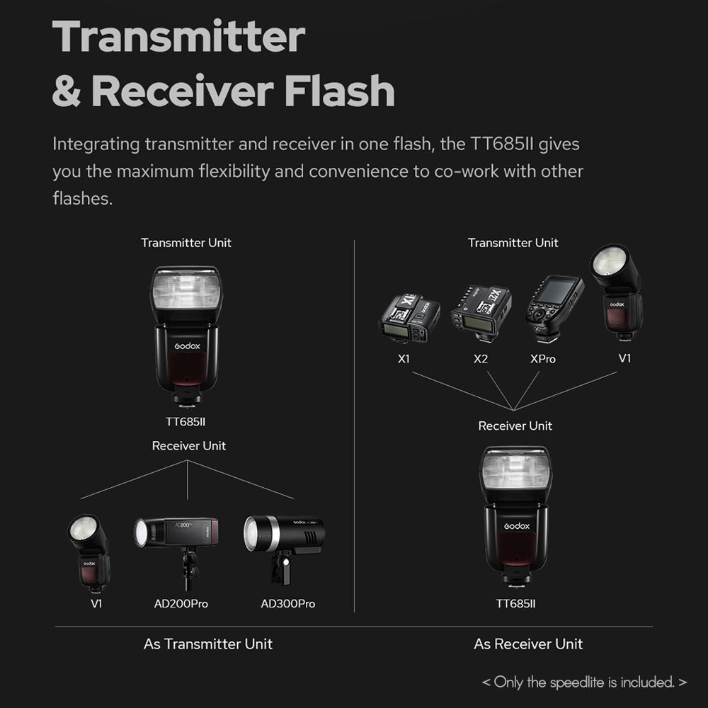 [High-Quality Speedlite] 1/300s-1/20000s flash duration, guide number ≈ 60 ISO 100, with port, improving flash performance, shortening recycle time, and extending working time.