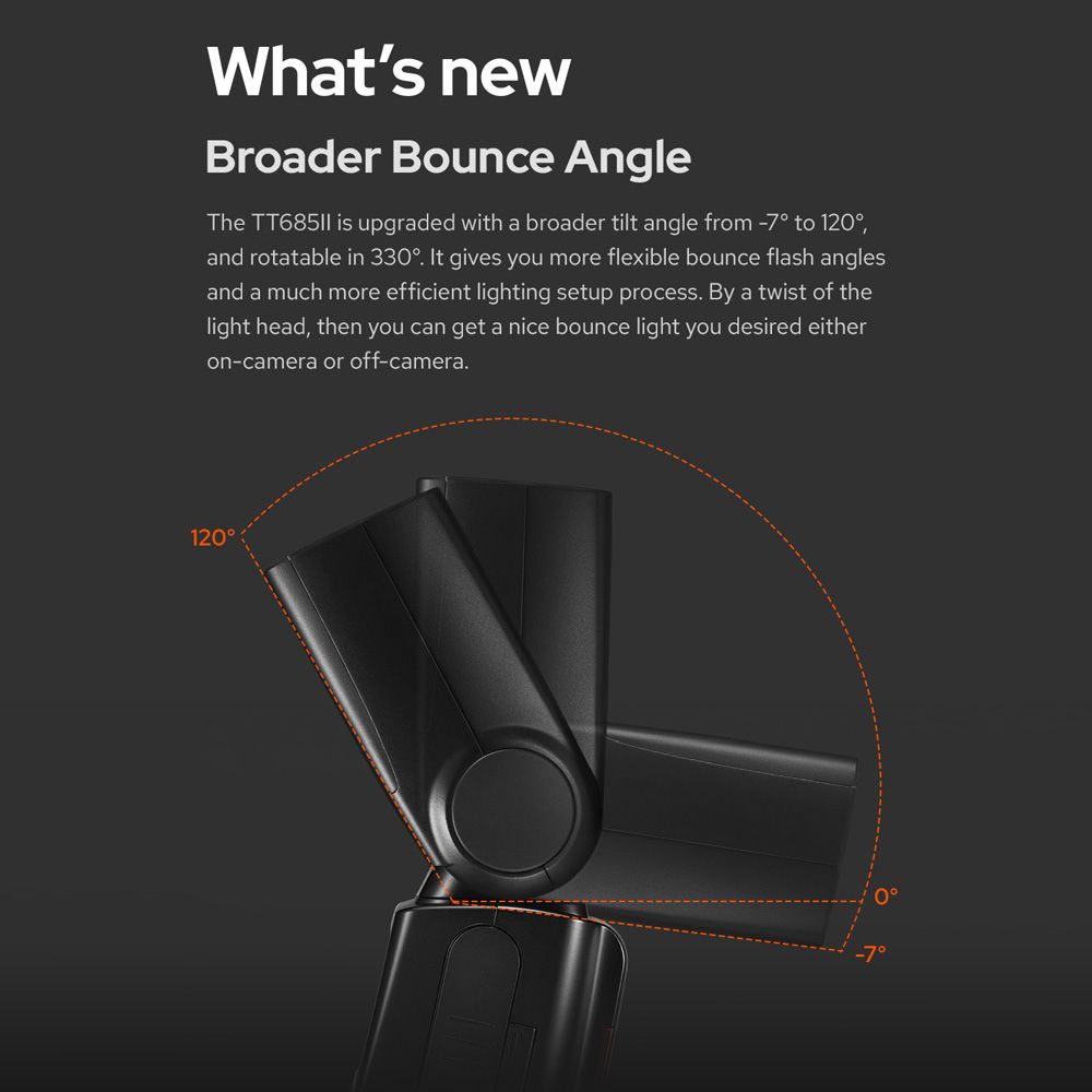Manual Zoom: Swinging/ tilting flash head (bounce flash): 0-330°horizontally and -7°-120° vertically