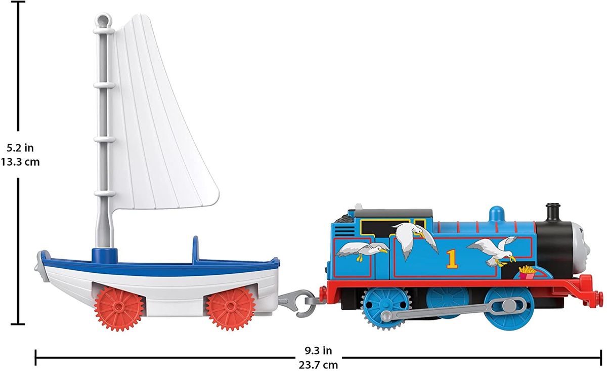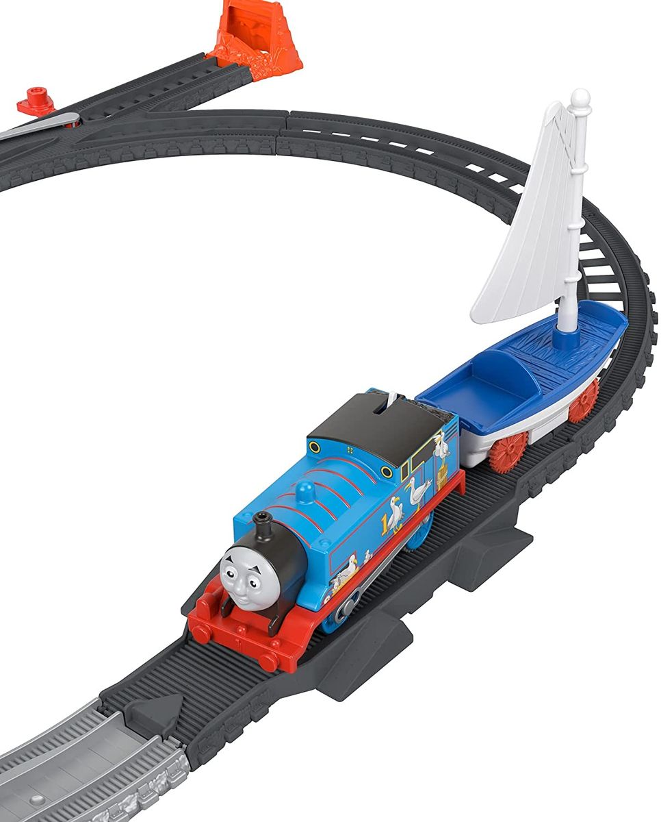 Includes over 3 .5 feet of track for kids to build out their railway | Kids can use the track switch to choose which direction the battery-powered, motorized Thomas engine races along. | All aboard! Thomas can pick up Skiff the railboat at the docks. | Easy-rail track helps make it simpler for the youngest conductors to create their own railway adventures. |