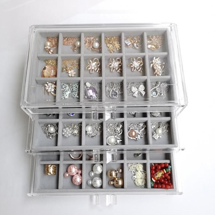 Buy Three-drawing multi-grid acrylic velvet storage box jewelry necklace finishing box earrings ring display stand velvet tray gray in Nigeria