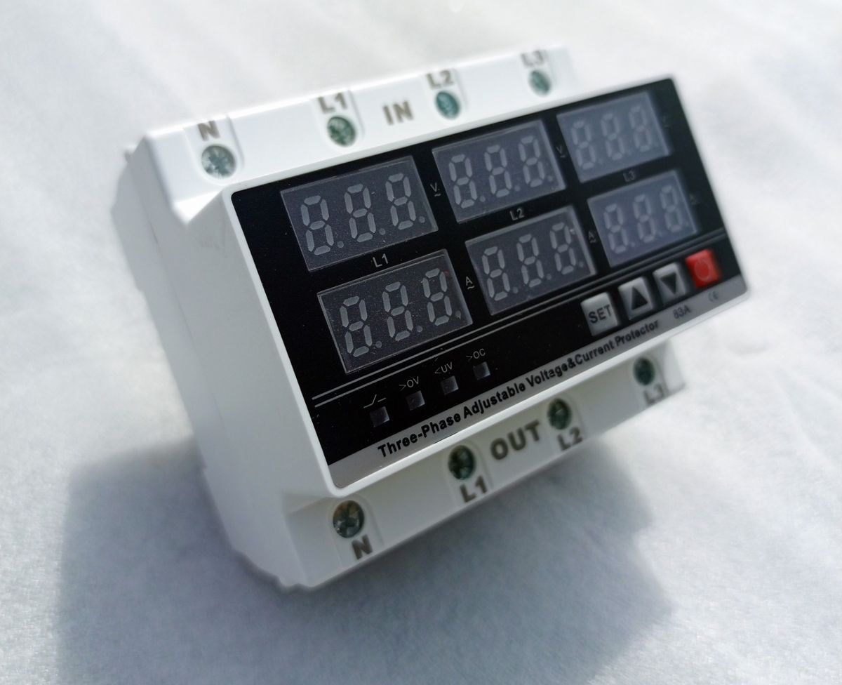 Three 3 phase Adjustable Voltage Current Protector 63A 220V 3P+N Over and Under Volt regulator with Current/load limiter Surge Protector
