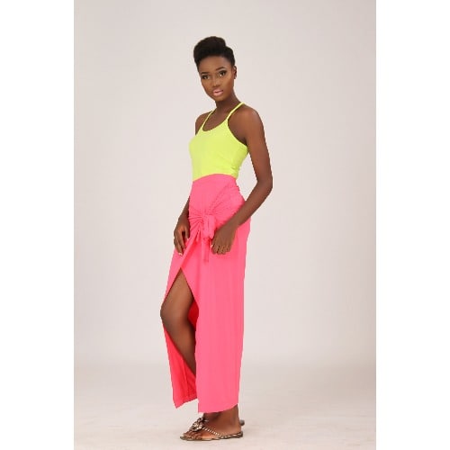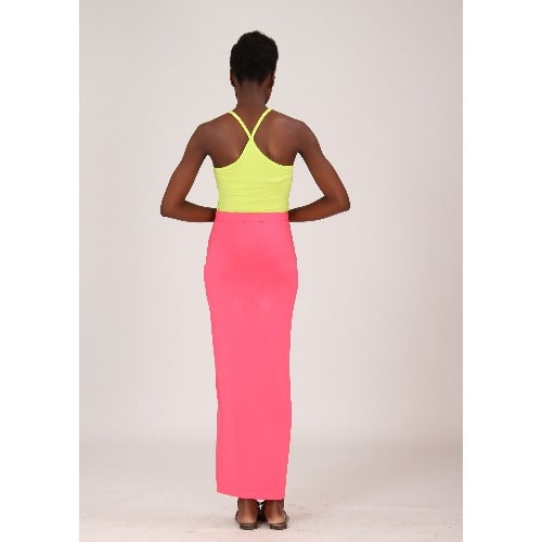 This hot pink tie front stretch jersey skirt is an absolute must-have! Playful, fun and flirty with a peek-a-boo slit and an adjustable tie front.
