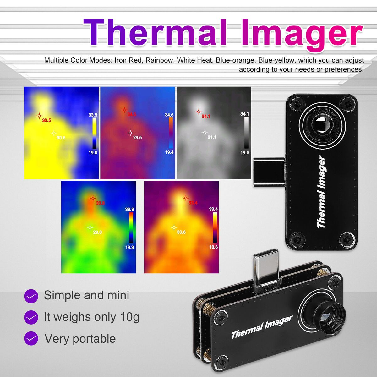 Multiple Color Modes: Iron Red, Rainbow, White Heat, Blue-orange, Blue-yellow, which you can adjust according to your needs or preferences.