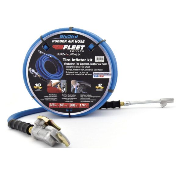 The Blubird tire inflator kit contains air compressor fittings and hose you will need in your commercial trucks. Carry this kit and you will not have to worry about the flat truck tire in the middle of a road anymore. Phillips (Made in USA) heavy duty aluminium universal glad hand and dual foot chuck inflator are perfect tools to let fill air into your tires anywhere at anytime. The storage bag allows your tire inflator kit to be readily available quickly.