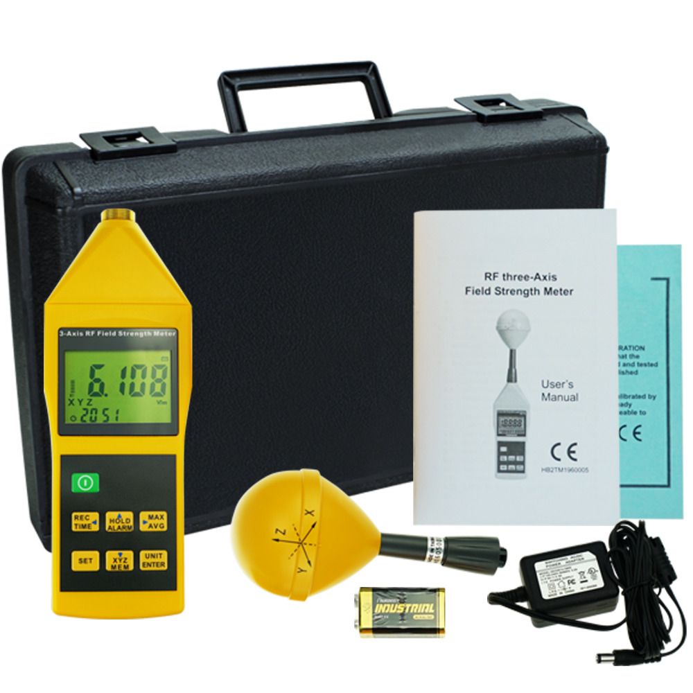 1x 3-Axis RF Meter 1x User Manual 1x 9V battery 1x AC adaptor 1x Calibration certificate 1x Protective hard case with foam
