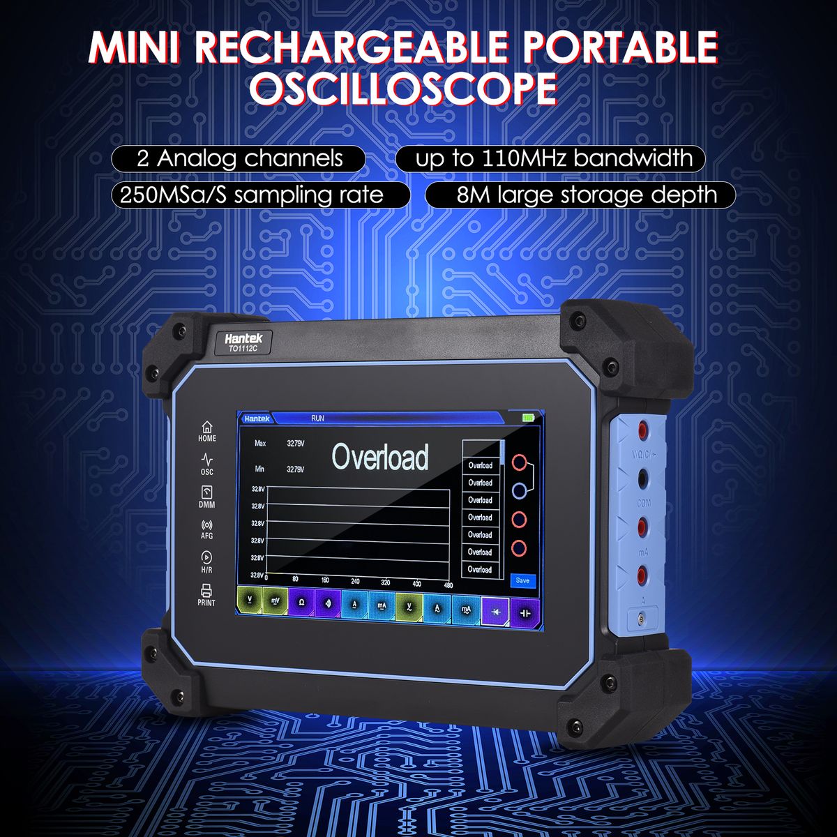 The multi-functional full touch screen oscilloscope has a thin body, light weight and is easy to carry. Unique hanging design, hands-free, anti falling and anti-seismic, sturdy and durable; It integrates oscilloscope, multimeter, signal generator and spectrum analyzer; Built in super large capacity battery, long endurance, support , and abundant .