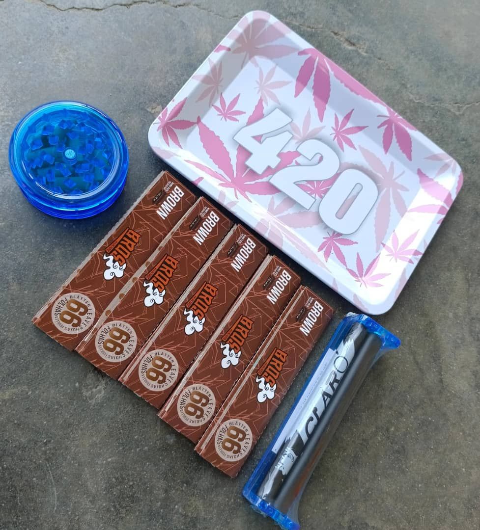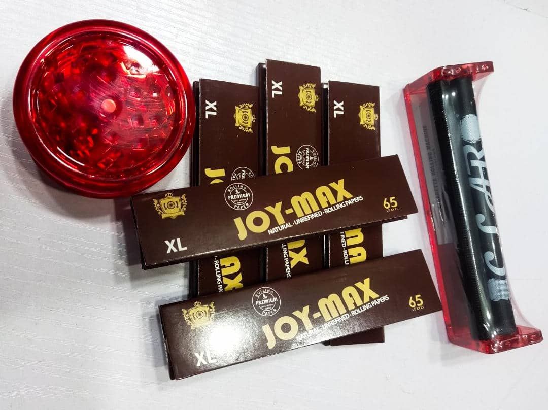 3 items you will get when you buy this product. 78mm weed roller, 110mm brown smoking papers and 40mm weed herb crusher/grinder. Quality products for a cheap price. The weed crusher helps to grind your weed after that, you insert your rolling paper into the weed roller machine, lace your grinded herb into the rolling paper in the roller, twist and turn and you will get a good rolled joint for your smoking enjoyment. Papers are chlorine free and has good gum Arabic