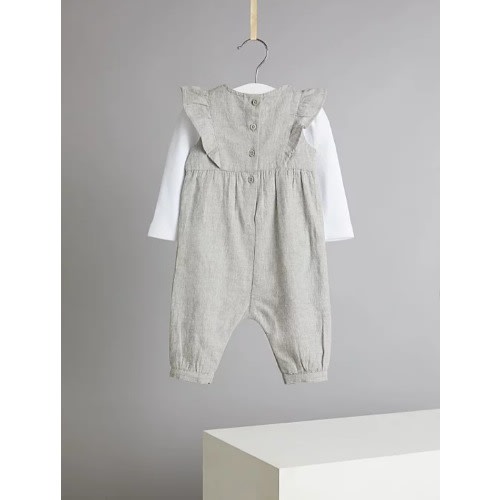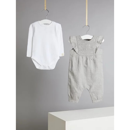 Designed by Billie for George, this dungaree and bodysuit duo is styled in a gentle colour scheme made up of brushed greys and embroidery for a look that radiates calmness and simplicity. The beautiful minimalistic bodysuit is contrived to be the understated foundation of this little look, with a crew neck and Billie’s signature ‘B & Star’ logo at the cuff, while the coordinating dungarees fasten with press-studs up the legs for ease of dressing.