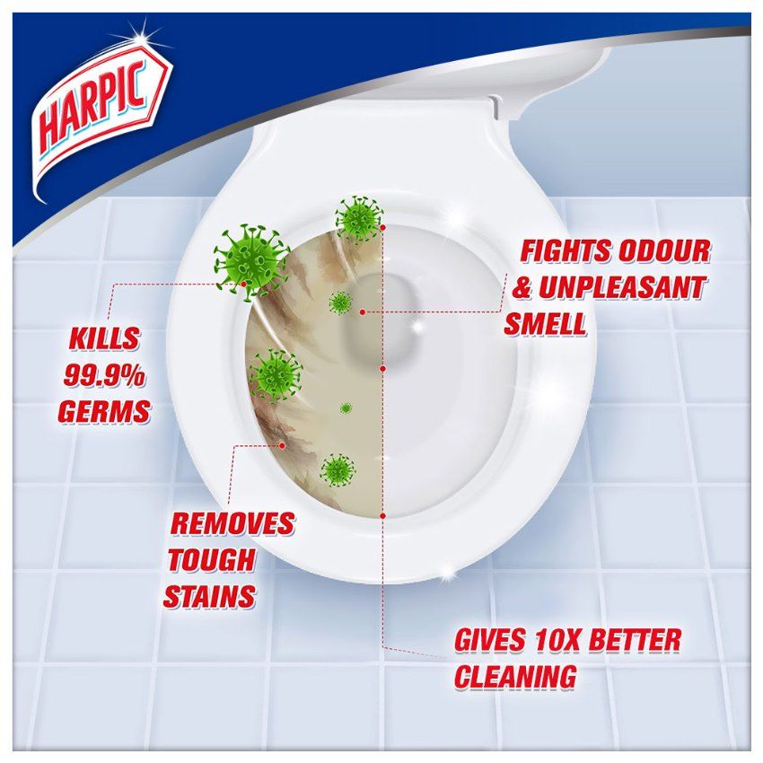 Regular use of Harpic toilet cleaner prevents the build-up of stains in the toilet bowl and keeps it visibly clean with effective removal of germs in the toilet. Harpic's strategically bent bottleneck shape lets you pour the liquid into deep corners under the toilet rim, without your hands touch the rim, and giving you all round cleaning. Harpic is suitable for all toilet styles and does not affect your septic tank.