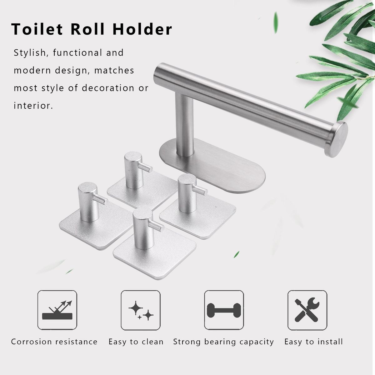 [Powerful Self-Adhesive]Toilet Roll Holder and towel hooks sticky backing is adhesive tape, strong adhesiveness and waterproof. There's no risk of dropping the toilet roll holder and it can be easily mounted on any smooth surface. Loading capacity over 10 kg, please use toilet roll holder after 24-72 hours.