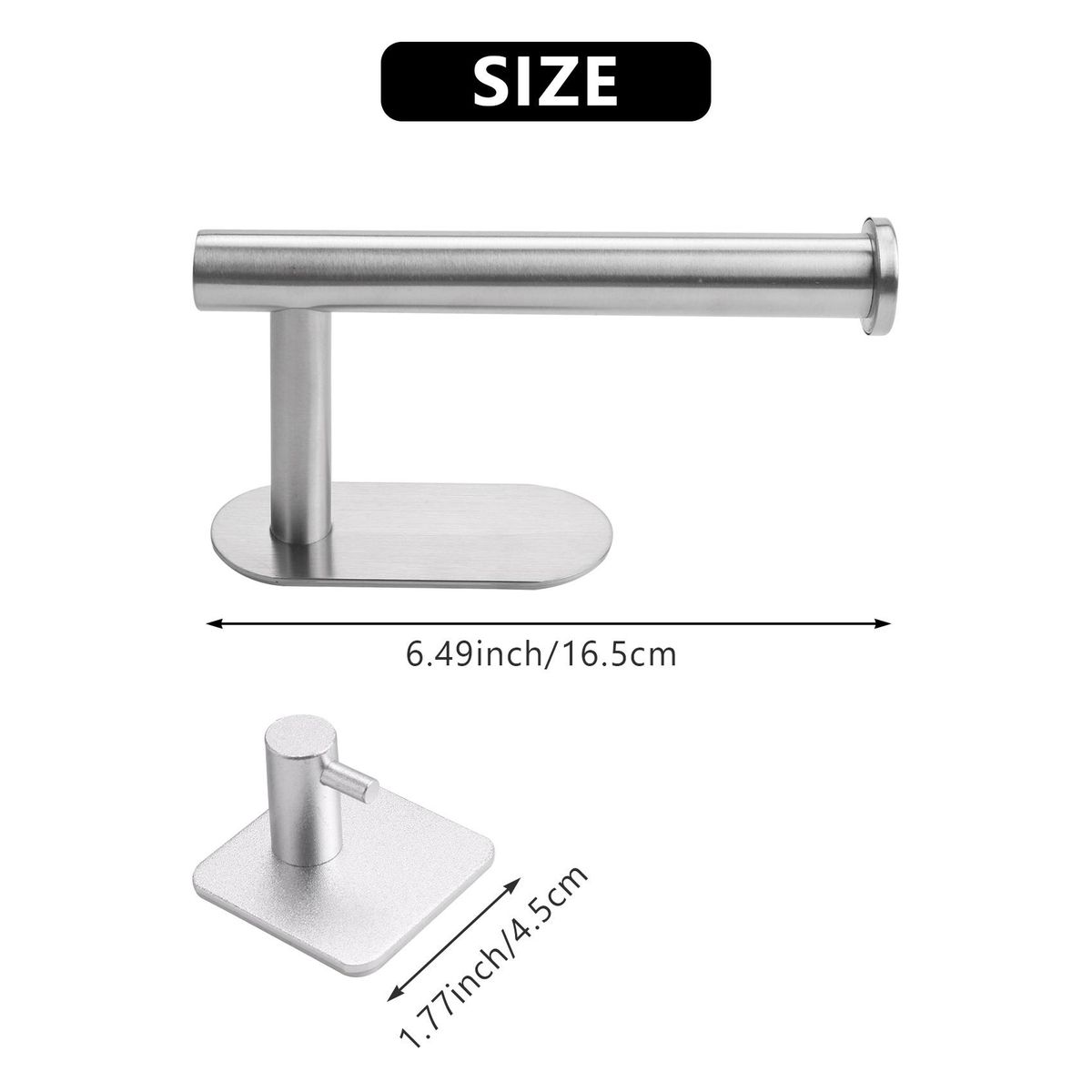 Detailed Information About The Product:[Premium Material & Safe]The toilet paper holder and the extra 4 towel hooks are made of high quality Stainless Steel - Brushed finish, Heavy duty, waterproof and rustproof. All stainless-steel constructions, ensuring long service life. No sharp edges, safe for kids to use. The L-shaped design of the holder ensures that toilet paper is kept away from the wall and can be rotated smoothly.