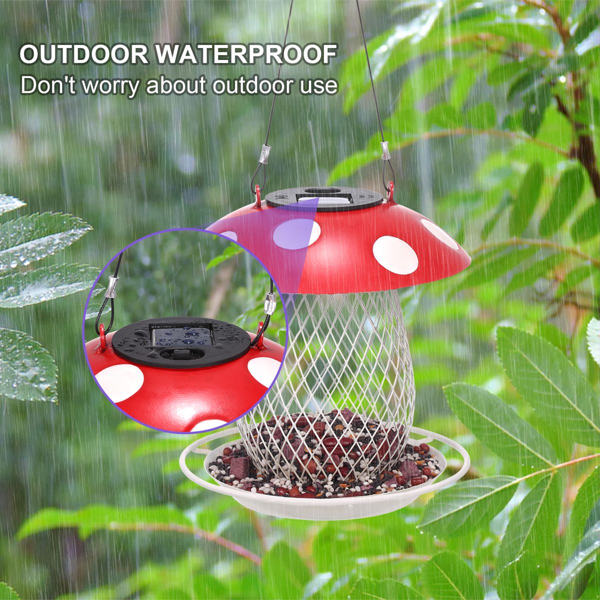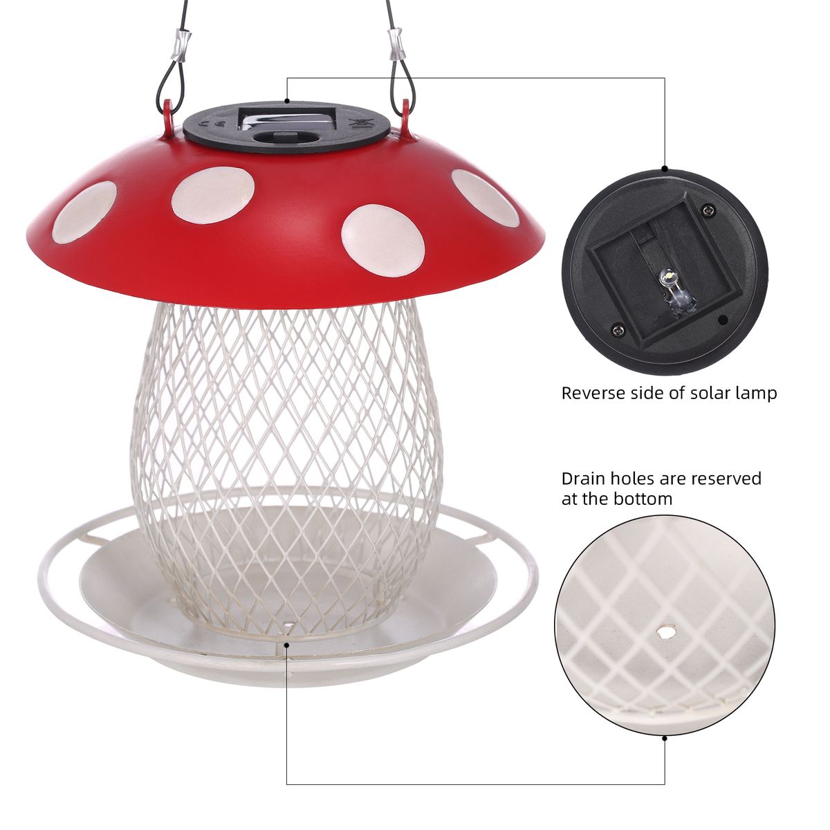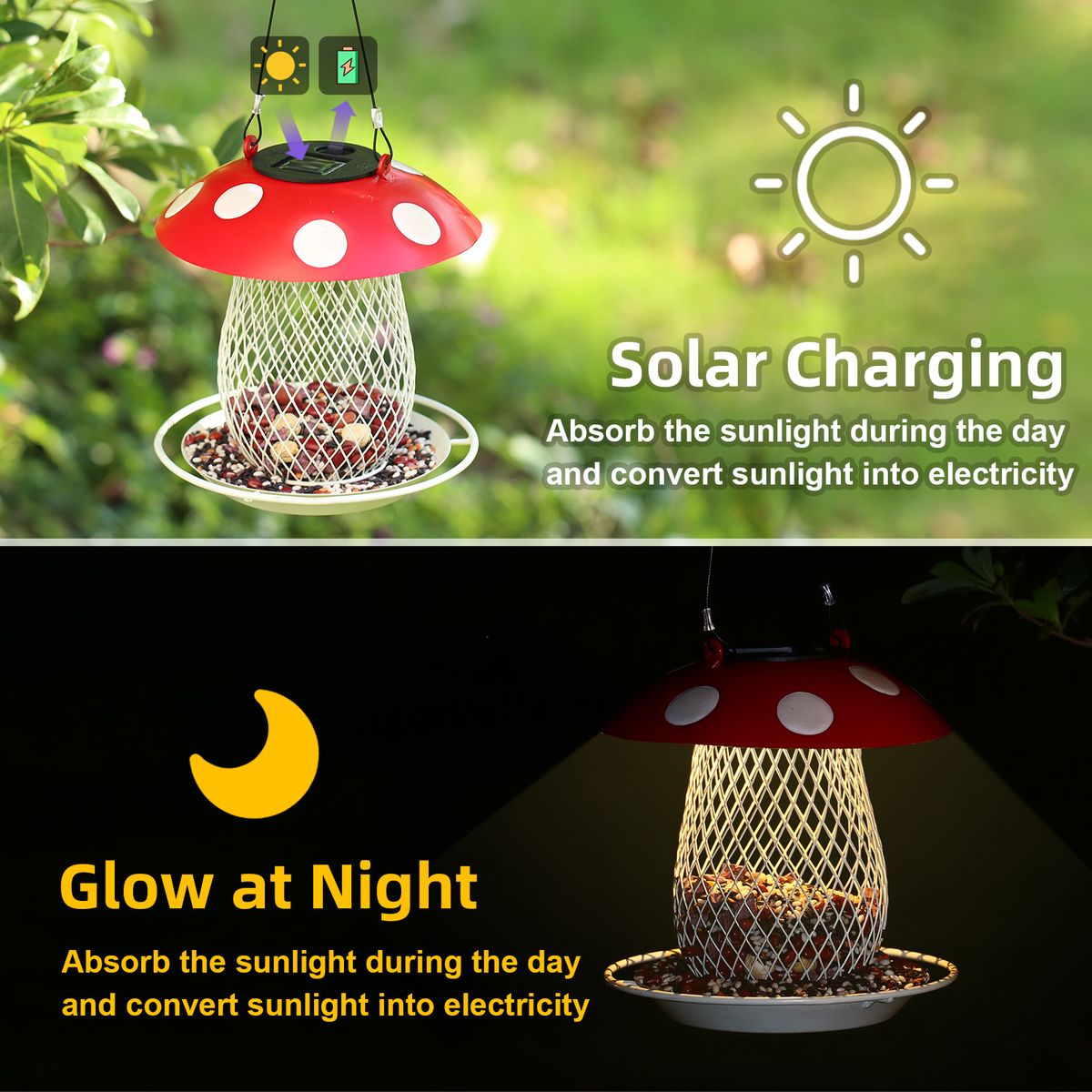 Dual-use: The cartoon mushroom-shaped bird feeder is very cute, hanging it in the garden or on the balcony can attract birds to come and feed. It is also a special solar light, with a solar panel embedded in the mushroom cap with white dots on a red background. The warm light under the night makes the bird feeder more romantic and lovely.