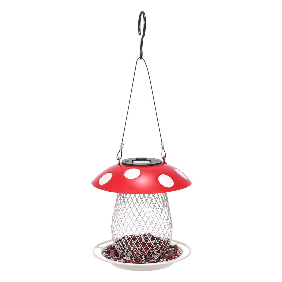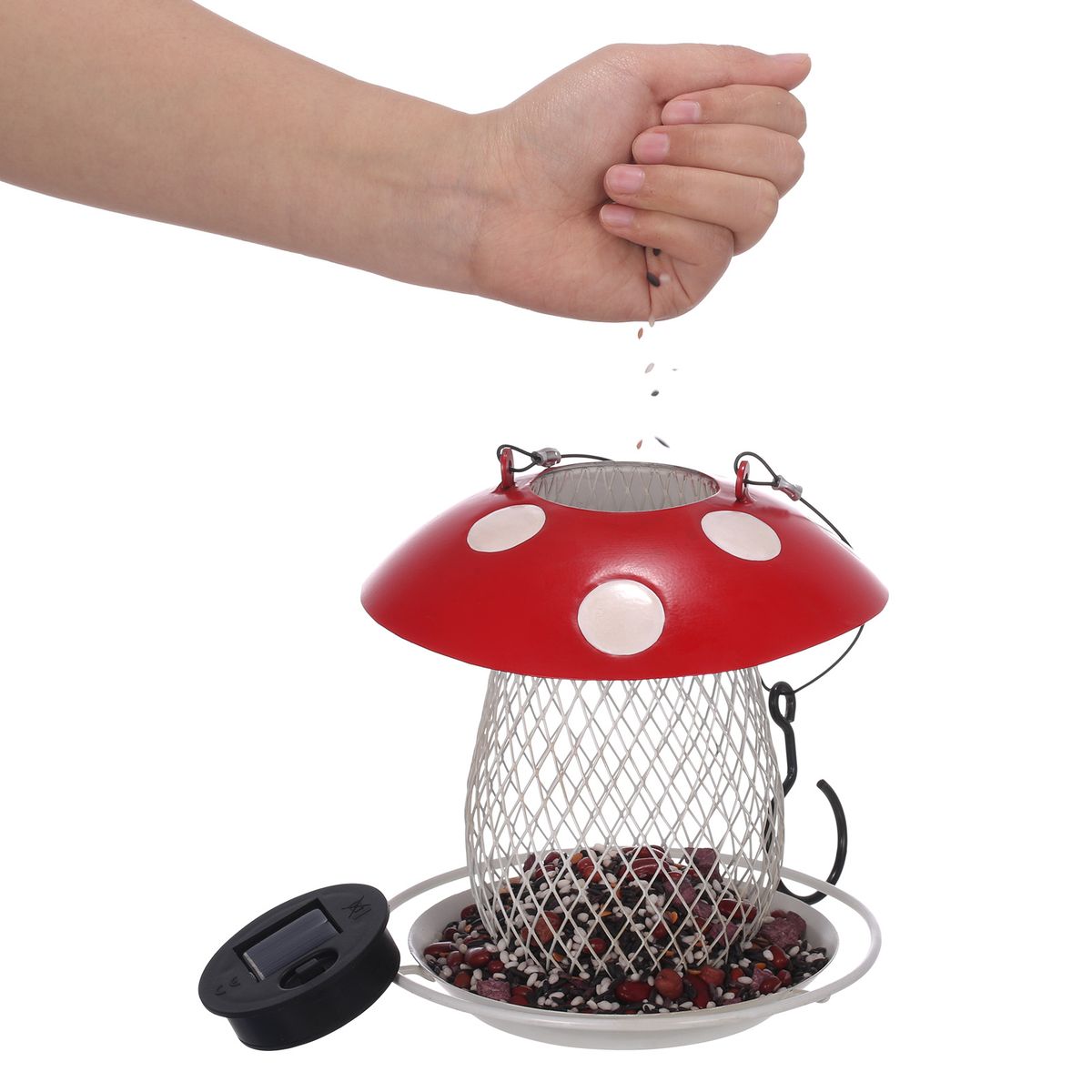 Description:The cartoon mushroom-shaped bird feeder is very cute, hanging it in the garden or on the balcony can attract small birds to come and feed. It is also a special solar light, with a solar panel embedded in the mushroom cap with white dots on a red background, the warm light under the night makes the bird feeder more romantic and cute. Handmade by professional craftsmen through welding, polishing, and coloring processes. The surface is baking paint skill, which is waterproof and rustproof and can be used outdoors for a long time. Hooks and tough, thin wire rope ensure the stable hanging of the feeder. The piece is designed with wire mesh to clearly see the seed inventory, and it has an upper cover to remove and add seeds. The bottom edge is wide for birds to feed on. The light is powered by a 100mA solar panel, no need for a cord, energy efficient and convenient, no need to replace batteries. Turn on the "on" button, the chandelier will automatically light up in the dark. General light is more than 6 hours, the light can continue to work for 8-10 hours at night. It is suitable for patio, terrace, garden, and other outdoor decoration spaces, adding more fun to your life!