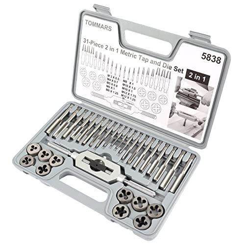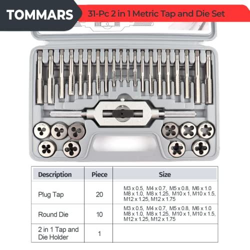 - Taps (2 of eah) & dies, sizes: M3 x 0.5, M4 x 0.7, M5 x 0.8, M6 x 1.0, M8 x 1.0, M8 x 1.25, M10 x 1, M10 x 1.5, M12 x 1.25, M12 x 1.75.