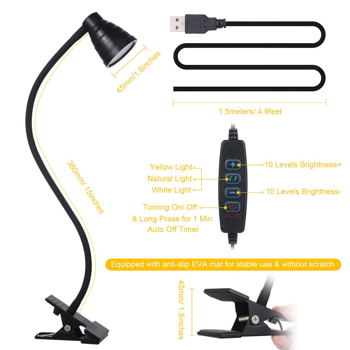 【4.5 Centimeters Clamp Design & EVA Mat】: Max clamp clip width up to 4.5 centimeters, it can be used perfectly with music stands, bookshelf, office tables, computer desks, headboards, etc. Equipped with EVA anti-slip rubber mat design for stable use and desk-protective without scratch.