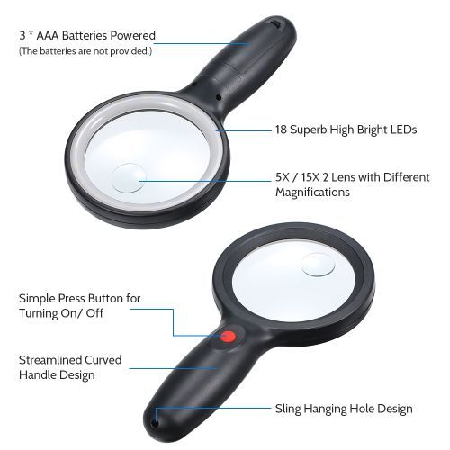 This superb magnifier with 18 high bright LEDs is especially designed for printing, machinery, carving, gardening, jewelry identification, collecting coins and stamps or other repairing work. Simple press button for turning on/ off, you can work more efficiently for magnifying items.