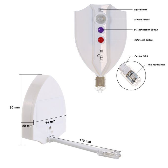 Is your bathroom lamp painfully bright in midnight? Dose your bathroom lamp disturb the sleep of your family? This toilet lamp is a perfect solution. It has build-in motion & light sensor, which means it will automatically light up when people approach within 2m in night and automatically turn OFF after people leave. It has soft light in 8 colors mode to decorate bathroom or in UV sterilization mode to fight off bacteria. Has this lamp installed, you will has your toilet more convenient and healthier.
