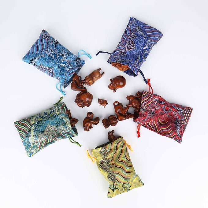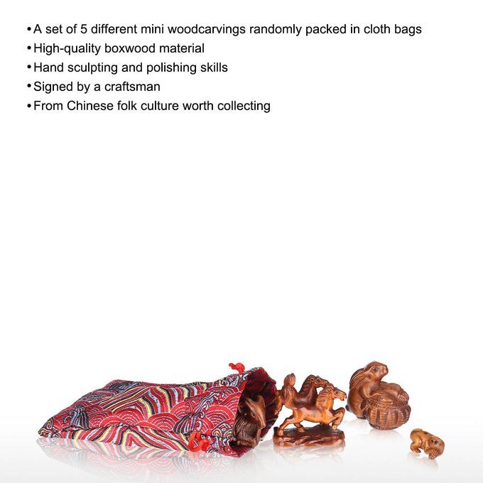A set of 5 different types of hand-carved mini boxwood carvings, each of which is signed by the craftsman. A total of more than 50 mini wood carvings are randomly packed in beautiful Chinese style cloth bags and randomly shipped, just like our life is full of wonderful surprises. It includes mermaids, Maitreya, horses, pigs, monkeys, snakes, turtles, masks, skulls and other things from Chinese folk culture. It outlines a strong sense of life and imagination, and symbolizing life in all aspects. Using high-quality boxwood, small wood carvings are hand-carved and polished by skilled craftsmen to create popular classics with meticulous craftsmanship. Each wood carving is about 3-5 cm high, with beautiful and natural wood grain and smooth touch. It can be your own collection or a beautiful gift for Christmas or birthday.