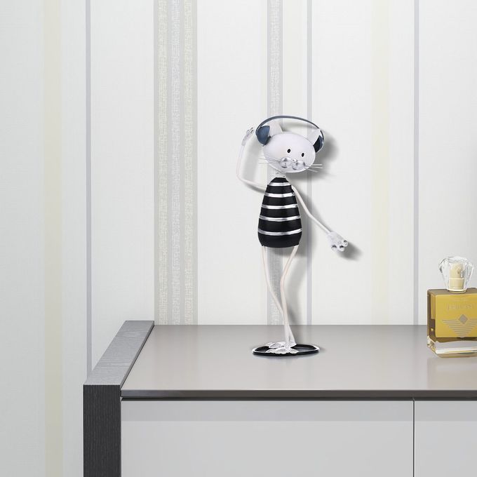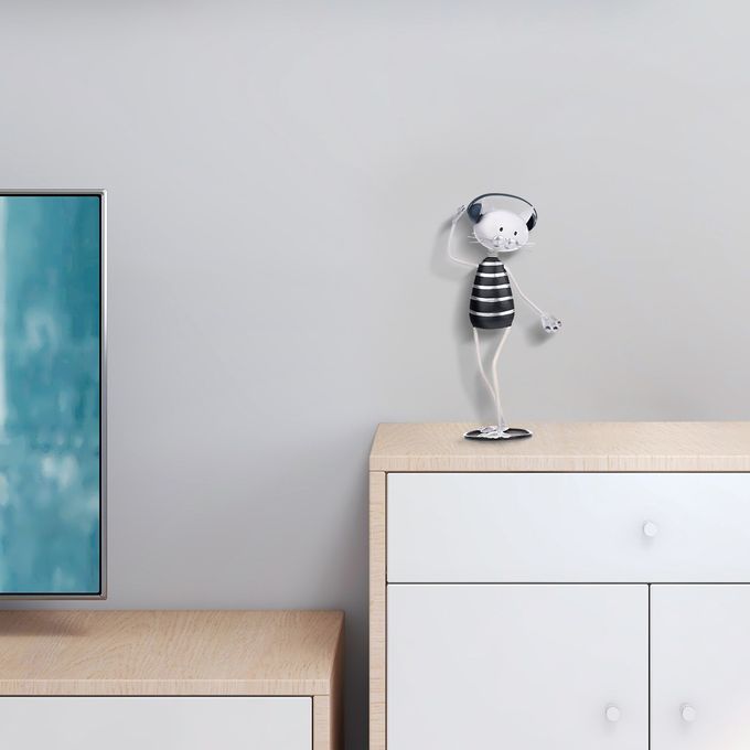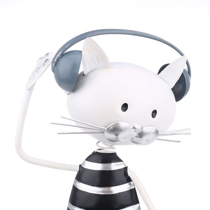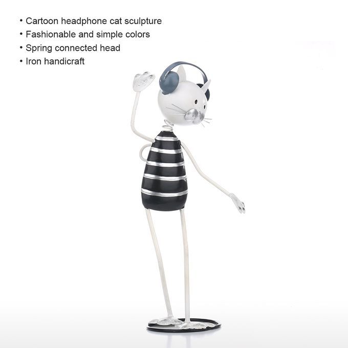 The cartoon cat is listening to music with headphones, and the anthropomorphic hands are waving up and down, immersed in the world of music. Adopting iron raw materials, hand-made by stamping, welding, baking, and other processes. The base of the baking paint, the clear and eco-friendly painting makes the surface of the sculpture smooth and rustless, the black and white color is simple and fashionable, and the lightmapped making the sculpture full of technological sense. The head will slightly shaken by the spring connection as if the kitten is shaking his head in the rhythm of the music. The simple and cute cat sculpture complements the modern home decoration, and the animal shape is interesting displaying. The perfect gift for cats and music lovers, it must be loved.