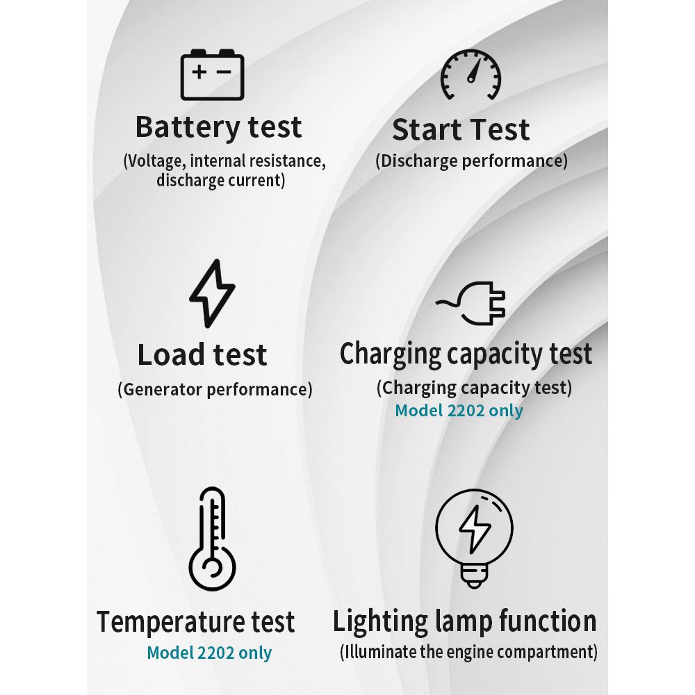 ET2202: temperature test, capacity test, battery test (battery voltage, internal resistance, discharge current), starts-test (discharge performance), and load test (generator performance).
