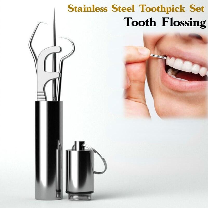 F1CA Toothpicks Pocket Set Stainless Steel Reusable Portable Metal Floss Tooth Picks with Holder for Outdoor Picnic Traveling
