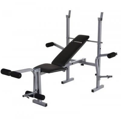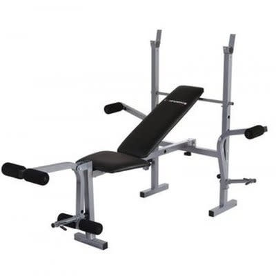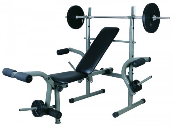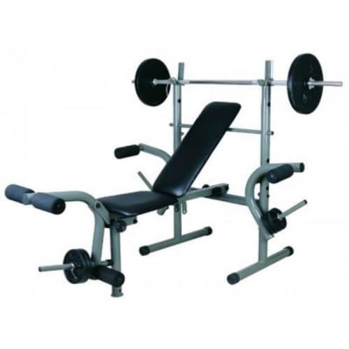 This is a well-constructed bench with 4 positions adjustable backrest (incline to decline), 3 position height adjustable seat, heavy duty 2" uprights, height adjustable bar racks and leg unit with thick foam rollers. It has a max load of 220kg (including the user). Weight-lifting-bench-with 50kg plate and bar bell,25kg per each.