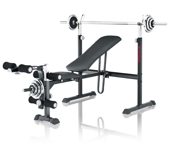 The One Station Gym features a 95-pounds weight stack that adjusts in 10-pound weight increments. This home exercise equipment, while limiting for more extreme weightlifters, still provides a variety of workout stations from chest press to leg extensions. The high-pulley station enables you to perform upper-body workouts, from lat pull-downs to cable crossovers, whereas the mid-pulley station focuses on core muscles for abdominal crunches. The low-pulley station features a station for seated and upright rows in addition to cable curls.