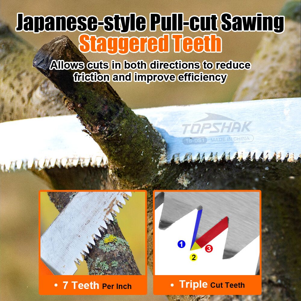 1. Japanese-style Pull-cutSawing, SK5 Steel Staggered Teeth, Allows cuts in both directions to reduce friction and improve efficiency.