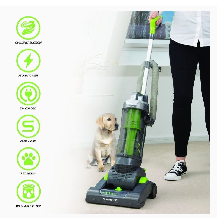 The Tornado F1 is an upright vacuum cleaner suitable for almost any flooring - The machine features a long 7m cable for easy cleaning between rooms. Our cyclonic suction vacuums use cyclonic separation principle to break up dirt from the air flow forcing dirt particles to the edge of the container - For a thorough clean every time. Washable Hepa filter, Hepa filtration sifts through the finest allergens and debris delivering the best results for a cleaner household. Extra long 7m cable with convenient cable tidy for easy storage . 750w motor delivers a powerful suction which collects dust and debris with ease. Air turbo 2 in 1 pet and stair brush and concentrates suction ensures ease in removing pet hair from carpets, stairs and upholstery with ease. Cyclonic Suction technology combined with rotary two stage height settings ensured optimal performance on both carpet and hard floor.