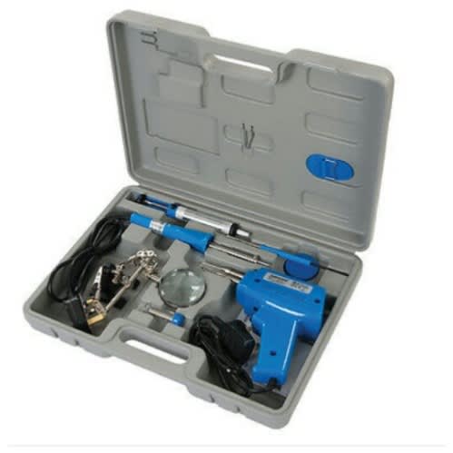 Features & details100W soldering gun for work on cables and sheet metal30W soldering iron with fine-point tip for precision workFor electronics, household and automotive wiringIncludes soldering iron stand, positioning tool, resin flux, solder,De-soldering tool, work stand w/h magnifying glass and spare tip for soldering gunProduct informationPart Number 845318Product Dimensions 33 x 6.5 x 25.5 cmItem model number 845318Item 1 Quantity 1Number Of Pieces 1Batteries Included? NoBatteries Required? No