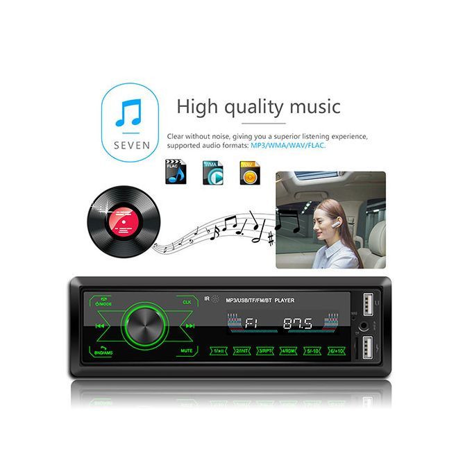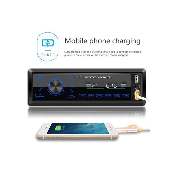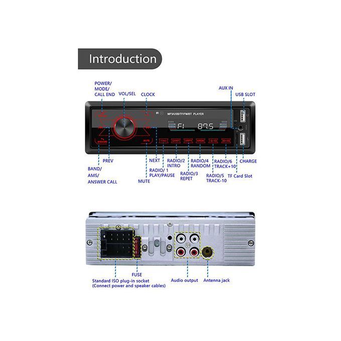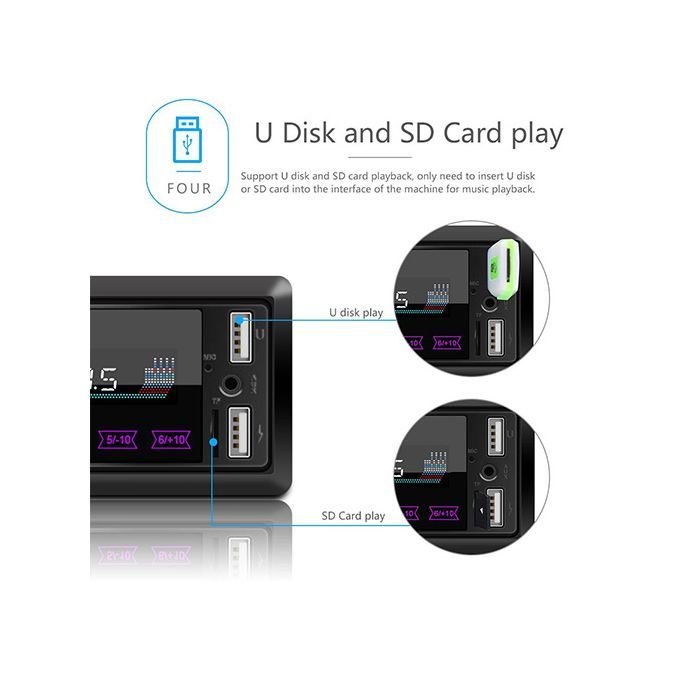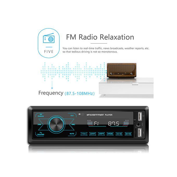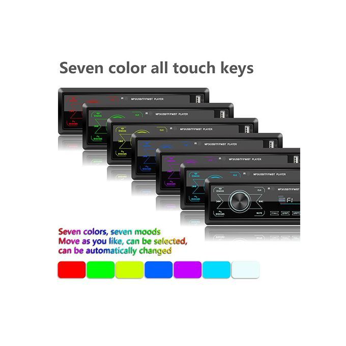 Appearance: This built-in wireless MP3 player is designed with full-touch control buttons and is equipped with 7 light colors to meet your different needs.USB: This built-in stereo radio has two USB ports, which can charge the phone or connect a USB flash drive to play music.Radio: This Bluetooth-compatible MP3 player supports radio, so you can listen to a variety of radio channels on the road.Other functions: This built-in wireless MP3 player has a time display function, supports MP3/WMA/WAV/FLAC lossless music formats, and has a memory recovery playback function.Wireless: This short-range stereo radio supports Bluetooth compatibility and allows you to connect to a mobile phone to play music.1. Radio2. Support card reader and U disk (audio)3. Accessibility4. Bluetooth function (answer/call, Bluetooth music)5.RCA audio output6. Touch the button7. Use the usb interface to charge your mobile phone.8. Colorful lights9. Short chassis10.ISO standard power interface