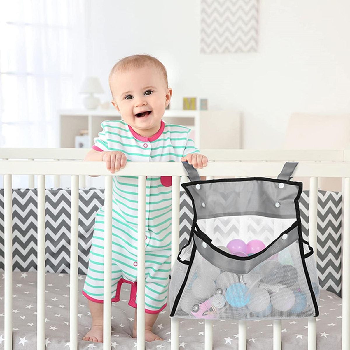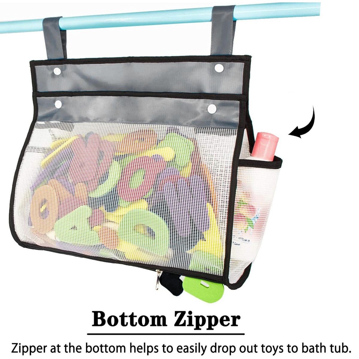 Our toy storage mesh bag, the perfect solution for keeping your child's bath toys and bathroom essentials organized. this bath toy organizer features large openings that make it easy for children to pick and place their toys. the bottom zipper allows kids to effortlessly put their toys into the bathtub, ensuring a happy and enjoyable playtime experience.