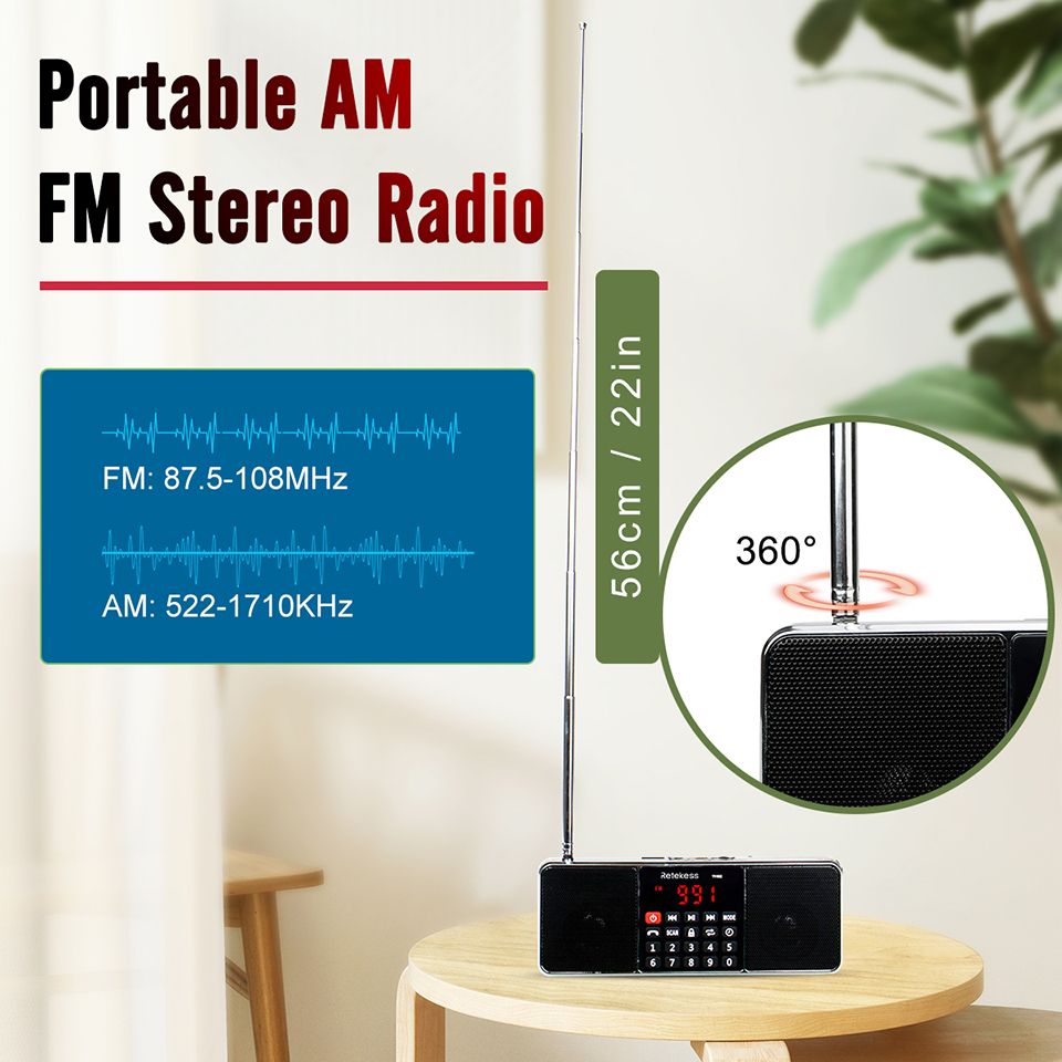 1. Multifunctional radio: Retekess TR602 transistor radio combines am fm radio frequency and wireless (30 feet range) speaker function, MP3 player, support TF card and U disk, AUX audio input2. Portable AM/FM Stereo Radio: Easily tune in to your favorite local station within this AM/FM range. The telescopic antenna of this radio is 56 cm long and is excellent at receiving signals. Enjoy stable sound with AM/FM mode wherever you are.3. 3 ways of frequency adjustment: Press the previous or next button to scan automatically. Press and hold the scan button for more than 3 seconds to automatically scan and memorize channels. Enter a number to search for direct channels. (Example: Press 9 +9+1 to search for FM 99.1)4.Bluethooth Radio: Can connect to any bluetooth device. It is compatible with iPhone, iPod, Android phones, MP3 players and other devices. It has strong connectivity for clear, continuous audio.5. Hands-free calling: The walkie-talkie is equipped with a high-definition noise-cancelling microphone. And the Bluetooth mode supports hands-free answering calls, and the signal is stable and free of interference. Long press the phone key to reject the call, and short press to answer the call. The phone button in Bluetooth mode can be used to make recent calls. (Maximum transmission distance is 32 feet).5. Hands-free calling: The walkie-talkie is equipped with a high-definition noise-cancelling microphone. And the Bluetooth mode supports hands-free answering calls, and the signal is stable and free of interference. Long press the phone key to reject the call, and short press to answer the call. The phone button in Bluetooth mode can be used to make recent calls. (Maximum transmission distance is 32 feet).7. Music playback: Play mp3/MAV music stored in TF card (≤16GB) or U disk (≤16GB). Enter a number to search for your favorite radio show or music.8. AUX mode: The AUX cable is connected to the charging cable, so the AUX port and the charging port are the same. A wireless FM radio can be used as a speaker to play music by connecting to an external audio device.9. Sleep timer: You can set the shutdown time before going to bed, and then turn on the radio to fall asleep. And the radio will automatically turn off at the set time. Timed shutdown: "240" will appear on the display when you press it for the first time, indicating that the product will automatically shut down after 240 minutes, and several printing presses will automatically shut down after 120, 90, 60, 30 and 15 minutes.10. rec ha rge able ba ttery: equipped with a removable 1000mA rechargeable lithium battery, only a USB cable is included in the package, the battery can be charged to the computer through a USB cable or an adapterSpecification:Body Material : Plastic