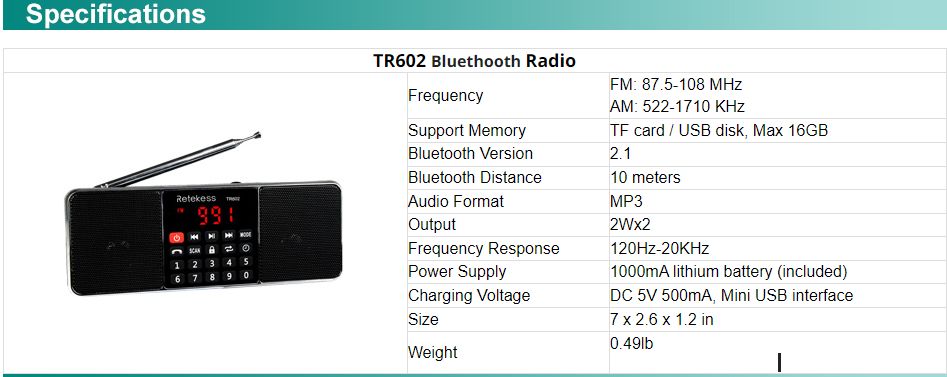 Dimensions (WxHxD): 7 x 2.6 x 1.2 inchesModel: TR602Frequency: FM: 87.5-108 MHz, MW: 522-1710 KHzSupported memory: TF card/U disk, maximum 16GBWireless version: 2.1Wireless distance: 10 metersAudio format: MP3Speaker: 40mm 16 core inner magneticOutput: 2Wx2Frequency Response: 120Hz-20KHzDistortion: 1.5W=1%, F=1KHzCharging voltage: DC 5V 500mA, Mini USB interfaceDimensions: 7 x 2.6 x 1.2 inchesWeight: 0.49 lbs