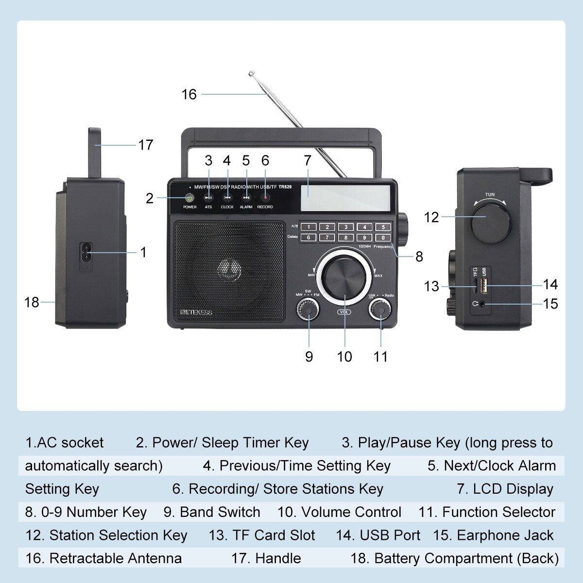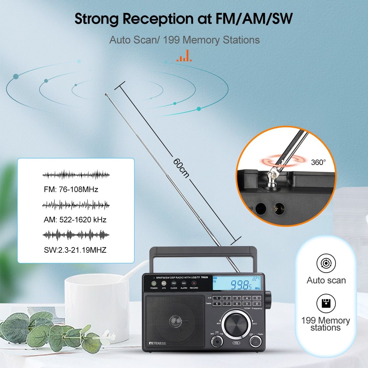 1X Retekess TR629 AM FM SW DSP Portable Radio Digital MP3 Player Loud Volume Big Speaker Recording Alarm Clock for Home and Elder