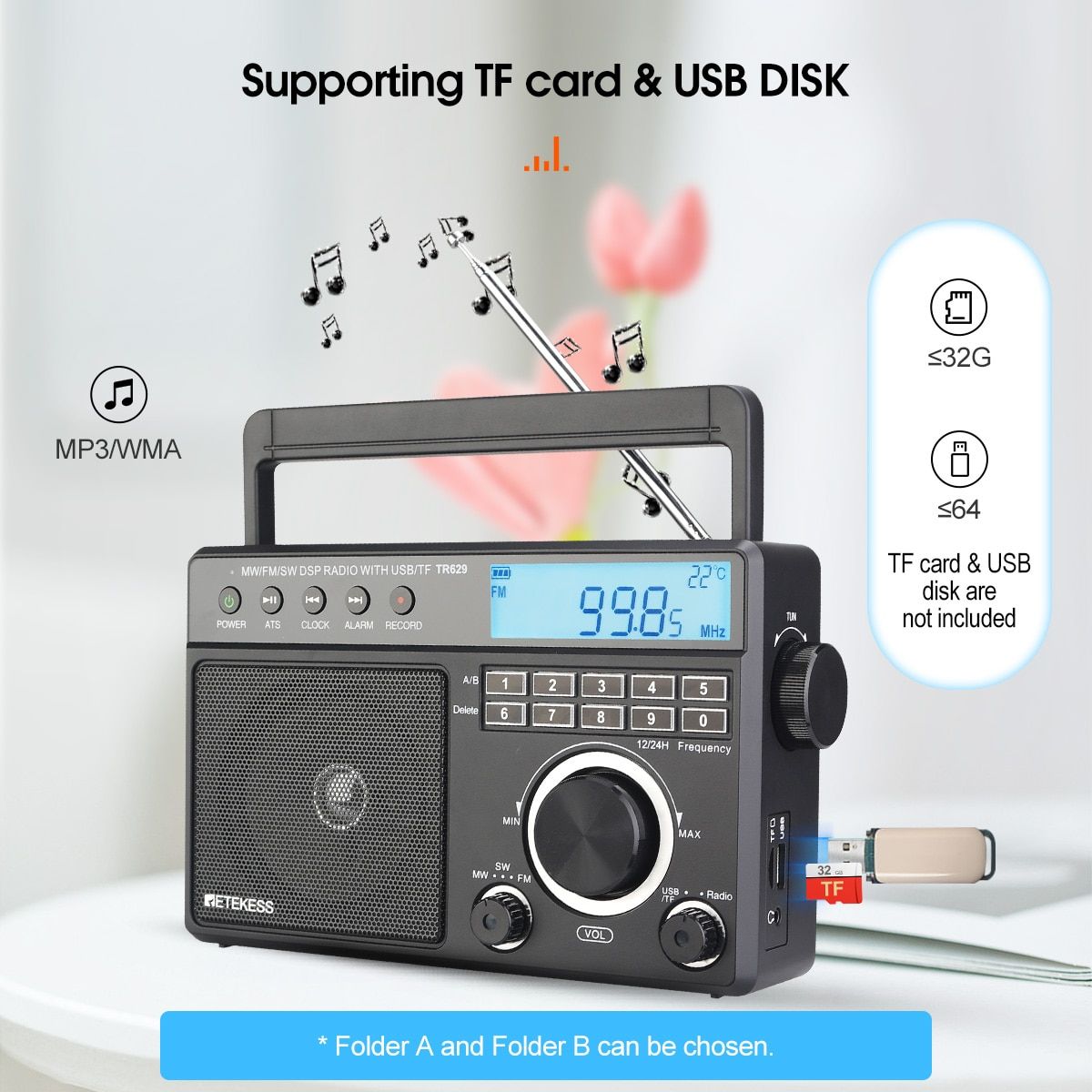 Format: MP3, WMA; TF≤32G, USB≤64G (TF card & USB disk are not included);