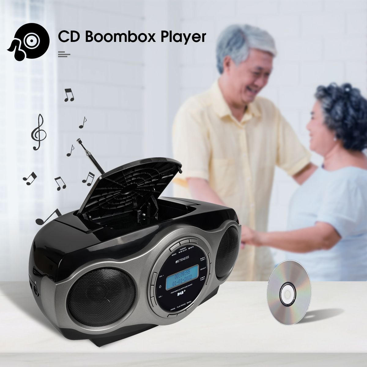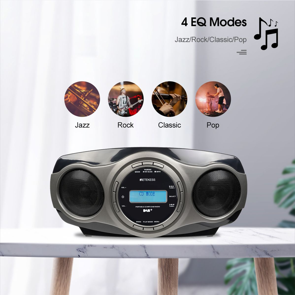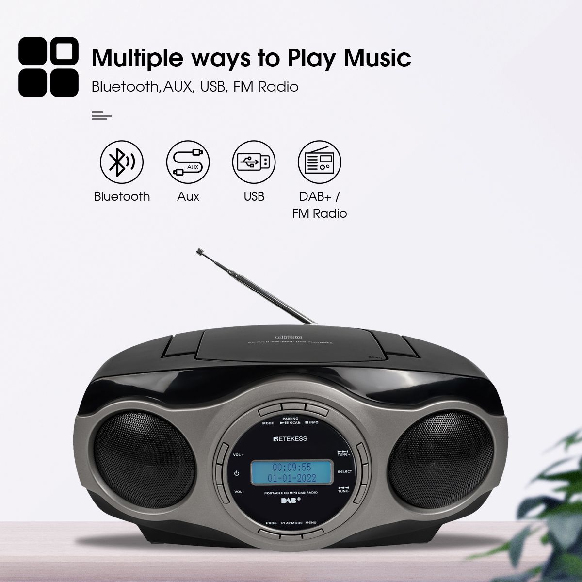 1. FM / DAB+ Radio:Besides FM radio, you can listen to DAB+ radio as well, which offers you more choices. And you will enjoy a higher quality audio with le interference and more stable signal. 2. Portable CD Player:With our top-loading CD player, you can enjoy your favorite CDs. It is easy to install and play back smoothly, which supports multiple audio formats, including CD, CD-R,CD-RW. 3. Bluetooth 5.0:This radio also features Bluetooth 5.0 capability, which allows it can be fast connected to other devices, such as your phones, computers, pads and so on, acting as a Bluetooth speaker. Note: The radio is used as a receiver when connecting Bluetooth. 4. Support USB Disk and Audio Input:Plug and play! The USB and Aux-in mode give you other choice to play your music, just plug in the AUX cable or USB disk to the radio, can the radio play audio directly. 5. 4 EQ Modes:The speaker supports EQ sound effects adjust, you can adjust the EQ sound effect to adapt to different music styles, including: Jazz/Rock/Claic/Pop. 6. AC/DC Power Supply:This radio is a good choice for home or on-the-go. The radio can be powered by AC adapter or 6*C batteries (not included). Charge your radio through the AC power cord for unlimited listening. Take 6*C batteries with you and enjoy music on-the-go. 7. Sleep Timer:The sleep timer is perfect if you want to fall asleep while listening to the radio. You don't have to worry about the radio playing all night when you are sleeping. It will turn off automatically ar a certain amount of time(0-15-30...90 min). Sleep timer canbe set form 10 minutes 8. Alarm Clock Function:Built-in alarm clock, set wake-up time to ensure you are never late for work, and wake up with the music that you set from USB, AUX, Bluetooth, and FM/DAB+ radio. 9. User Friendly Design:With a portable handle, you can easily take it with you anywhere. Friendly backlight design, you can use the radio at night and it is easy to check the settings.