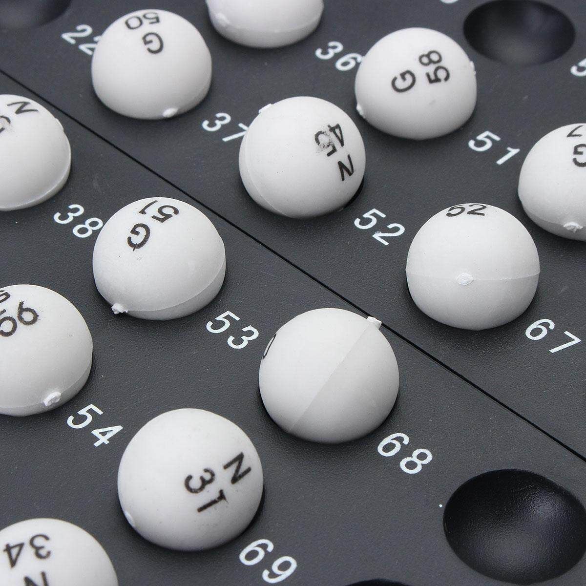 1x1xBingo cage1x1xBall display1x18xBingo cards1x75xBalls1x50xColoured marker counters