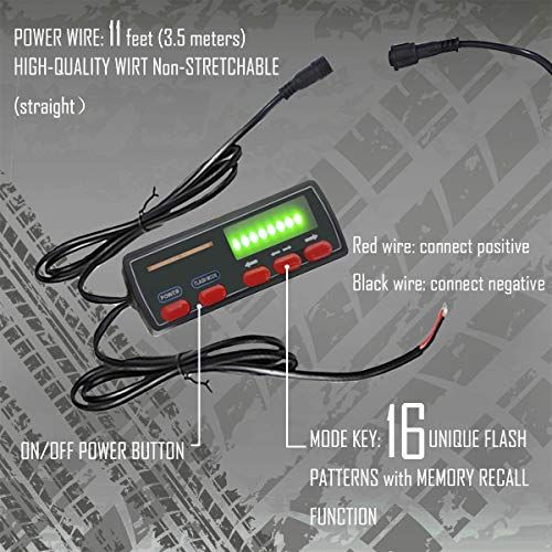- Easy Use 16 Modes - 16 Different patterns of strobing/flashing with just a press of a button, Inludes diretional flash patterns. (Left, Right, and Center Out, and so on) .Mode Memory Funtion is available.