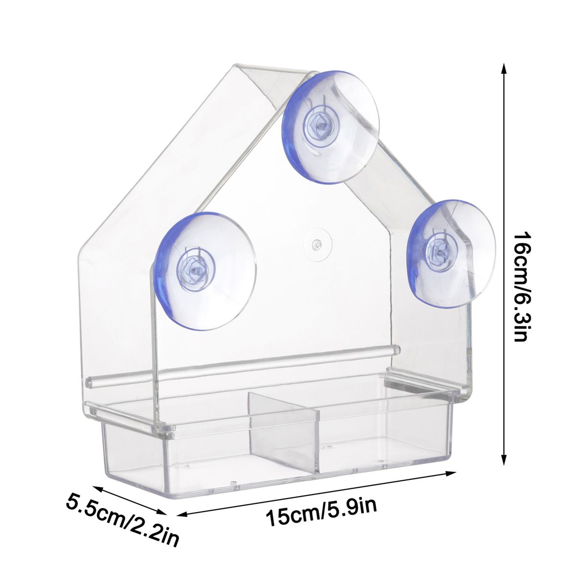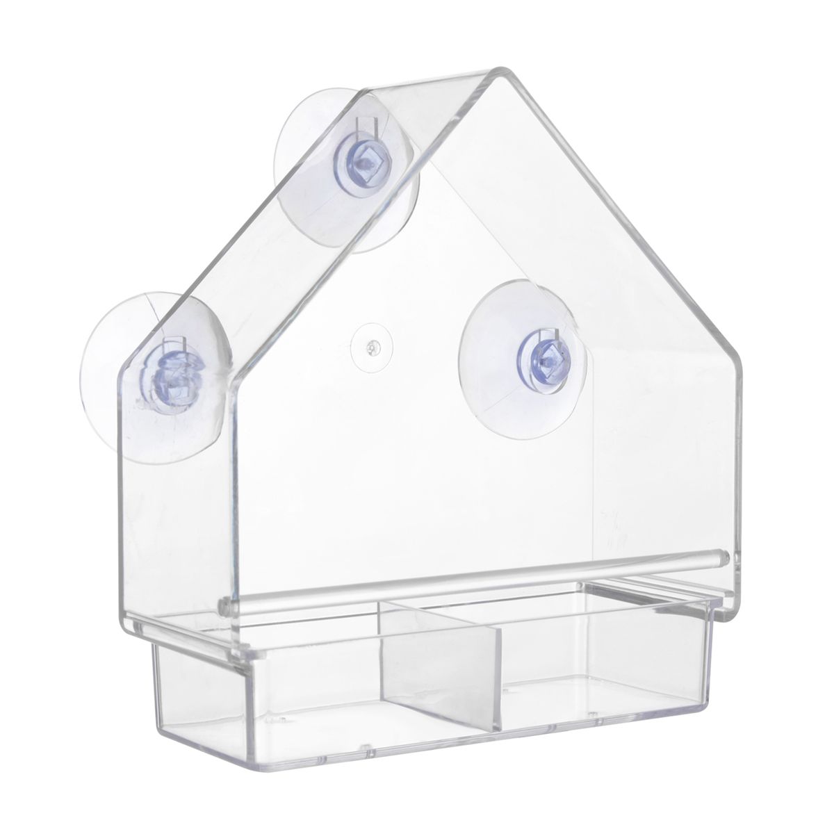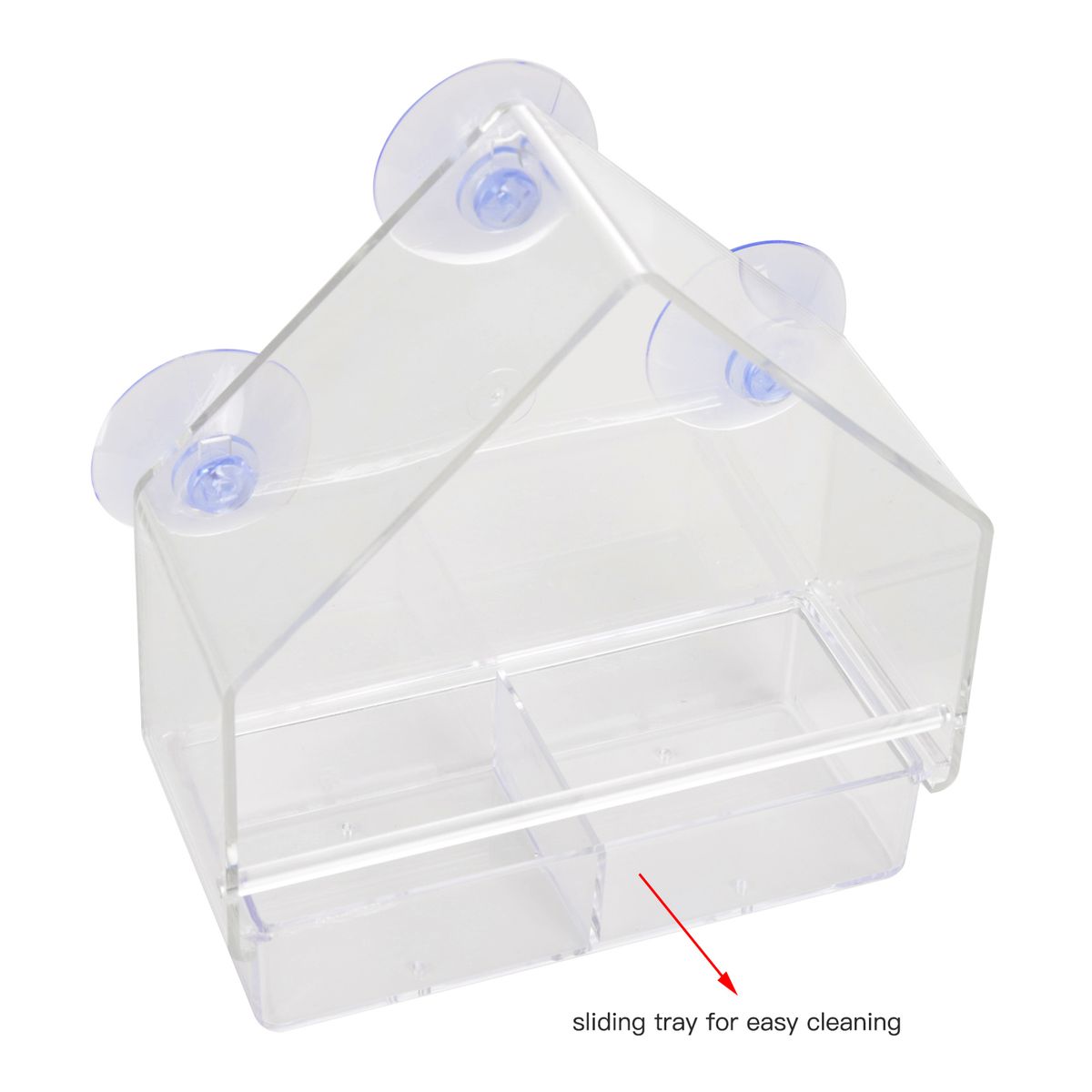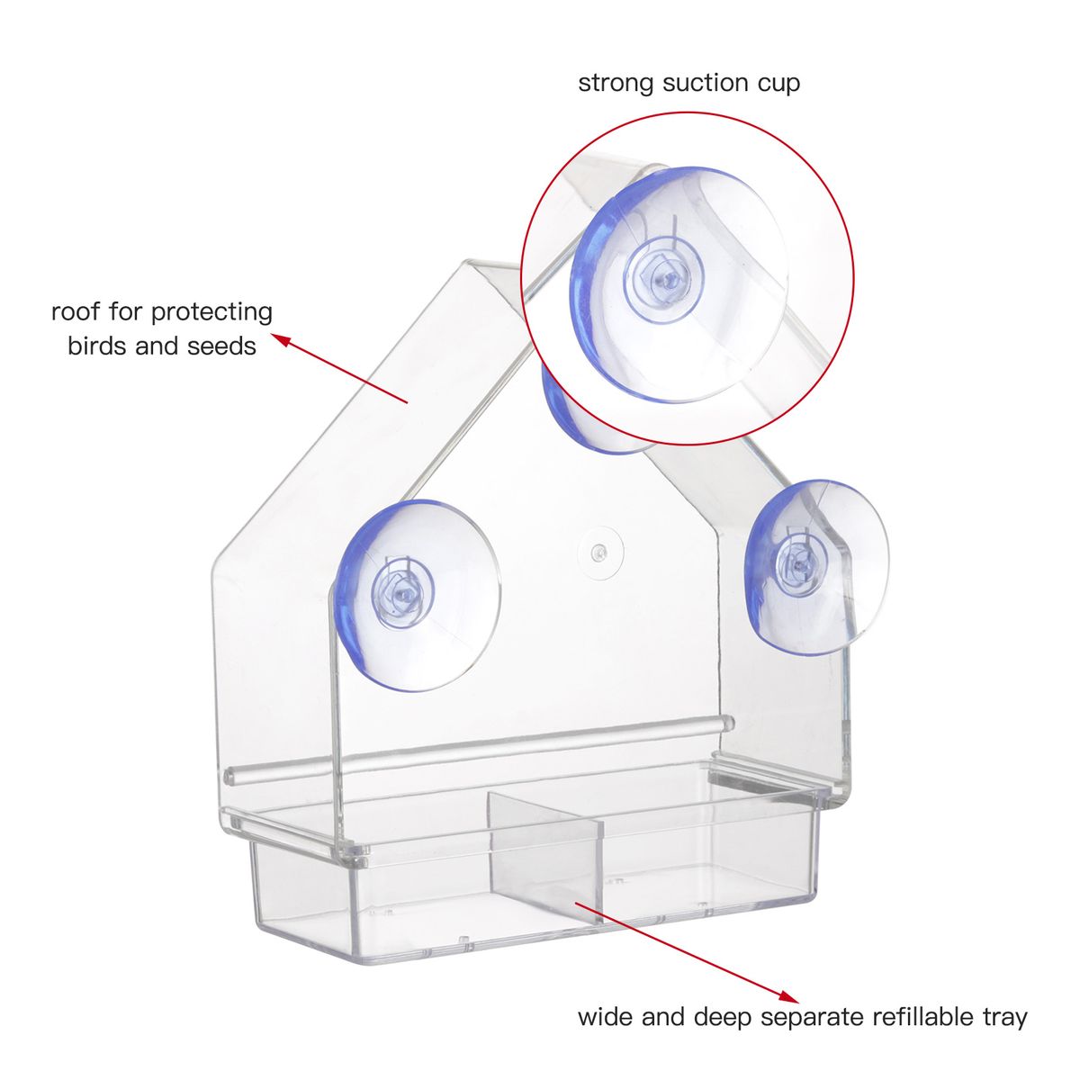 Transparent bird feeder with 3 strong suction cups, removable and refillable tray, perfect for mounting on your window or any smooth surface for a beautiful wild bird view.