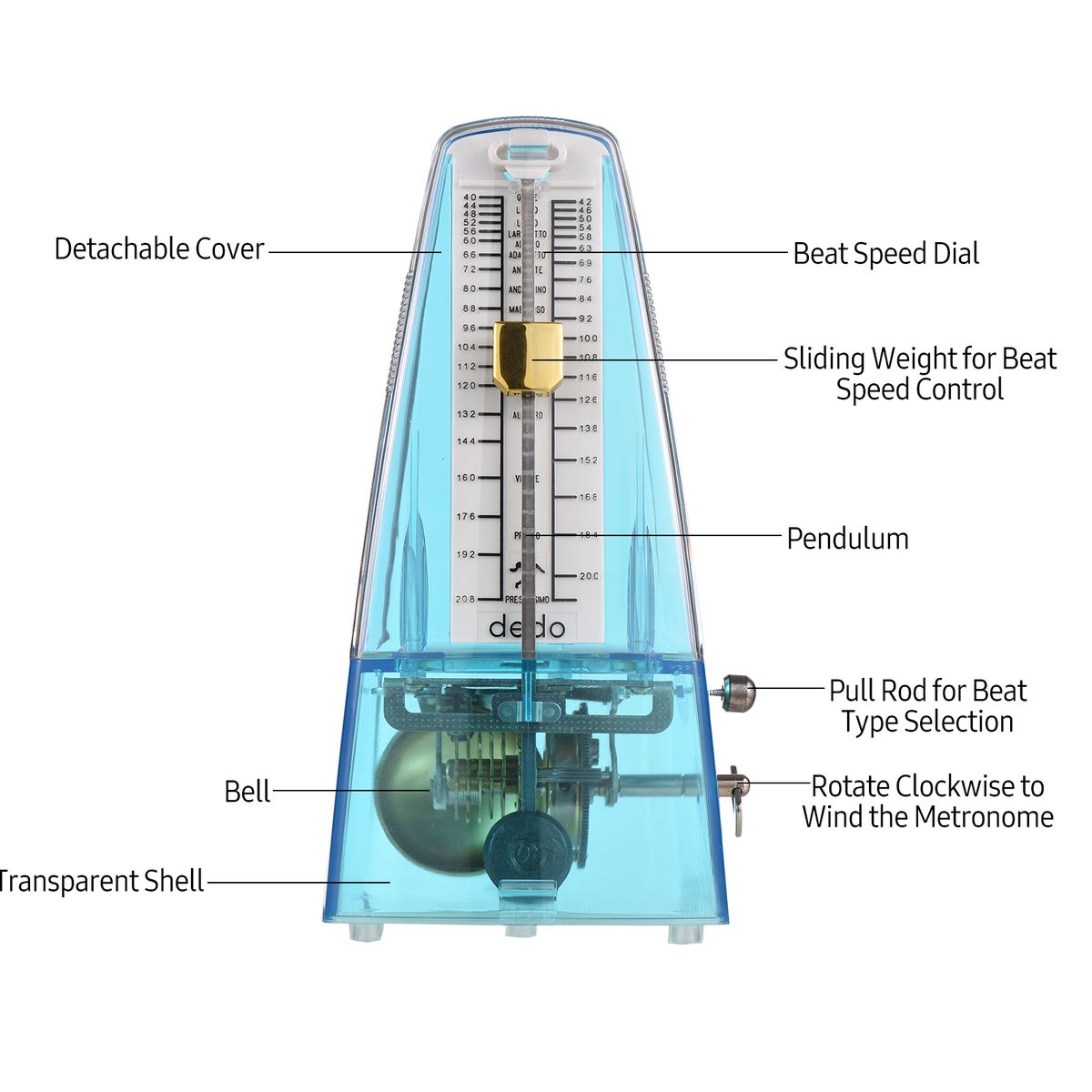 Features:The mechanical metronome provides beat type selection (0, 2, 3, 4, 6), and beat speed control (40-208 beats/min).